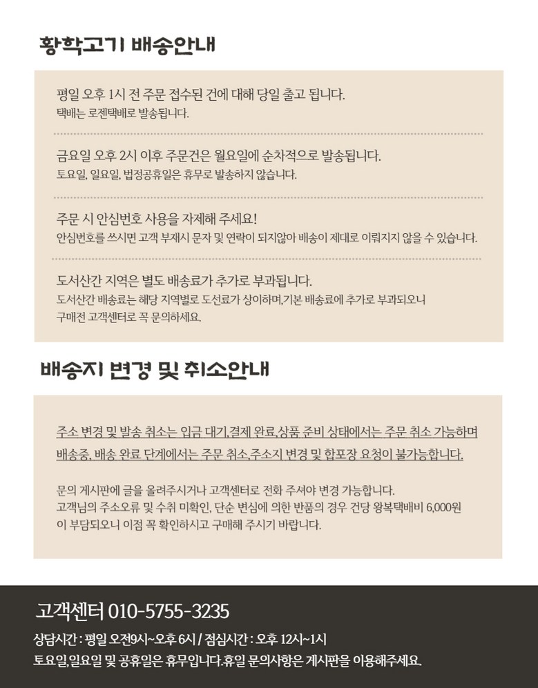 | 배송방법 | 신선/냉장/냉동 | 배송비 | 3,000원 - 50,000원 이상 구매 시 무료배송 · 도서산간 추가 배송비 - 제주 지역: 5,000원 - 도서산간 지역: 2,500원 |
