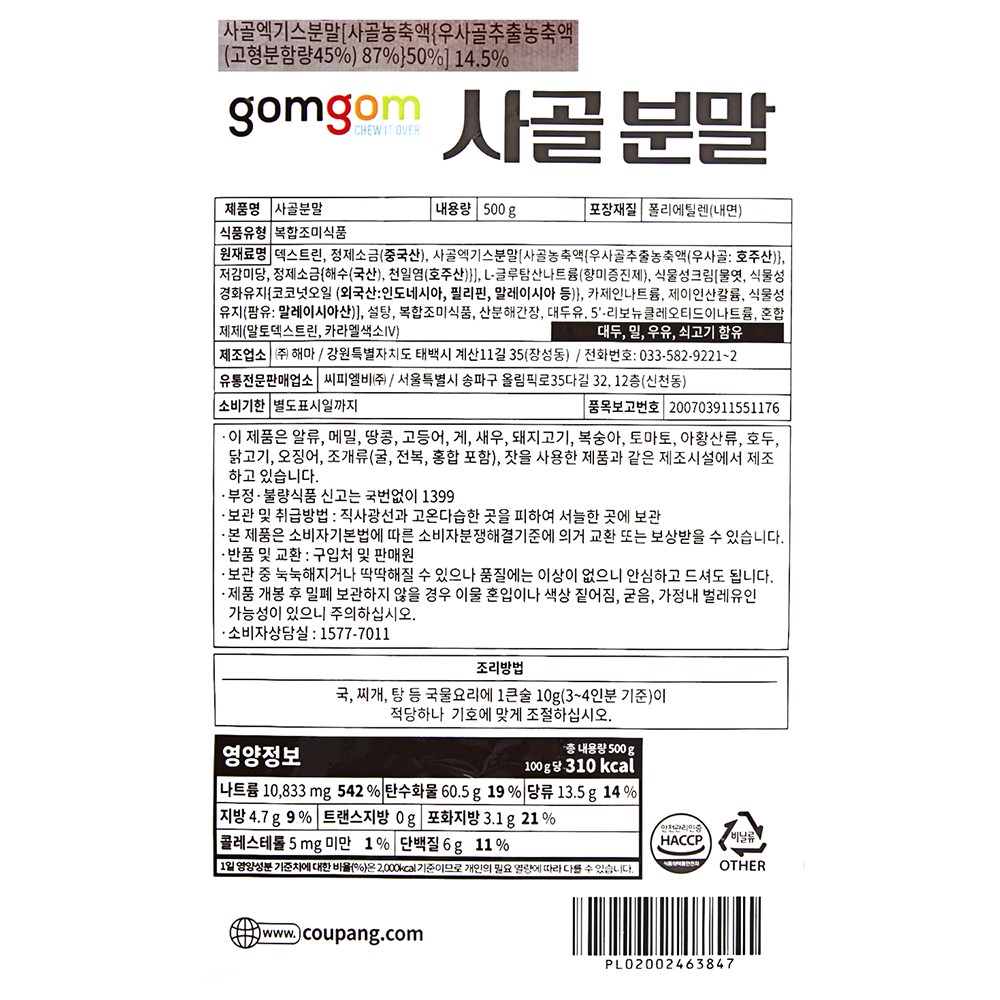 | 제품명 | 사골분말 | 식품의 유형 | 컨텐츠 참조 |
