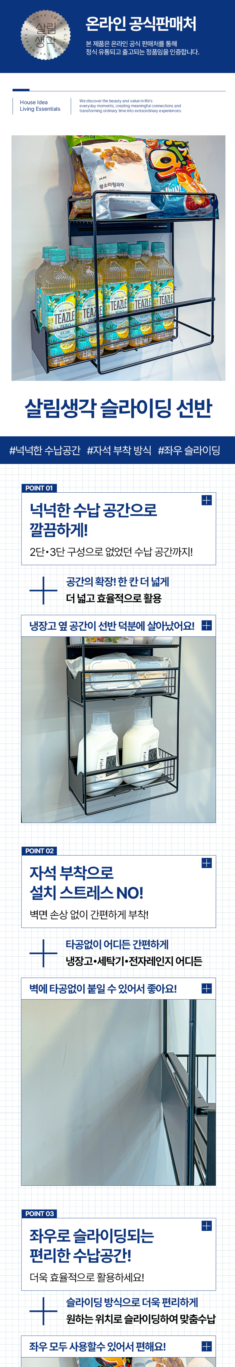 | 품명 및 모델명 | 살림생각 다용도 슬라이딩 냉장고 자석 선반 | 인증/허가 사항 | 해당사항 없음 |