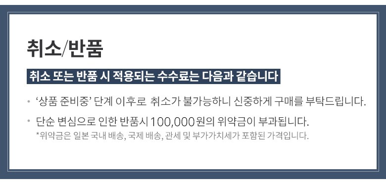 | 교환/반품 신청 기준일 | ㆍ단순변심에 의한 교환/반품은 제품 수령 후 7일 이내까지, 교환/반품 제한사항에 해당하지 않는 경우에만 가능 (배송비용과 교환/반품 비용 왕복배송비 고객부담) ㆍ상품의 내용이 표시·광고의 내용과 다른 경우에는 상품을 수령한 날부터 3개월 이내, 그 사실을 안 날 또는 알 수 있었던 날부터 ㆍ해외배송 특성상, '상품준비중'단계 이후부터 교환/반품은 상품 수령 후 가능 |
