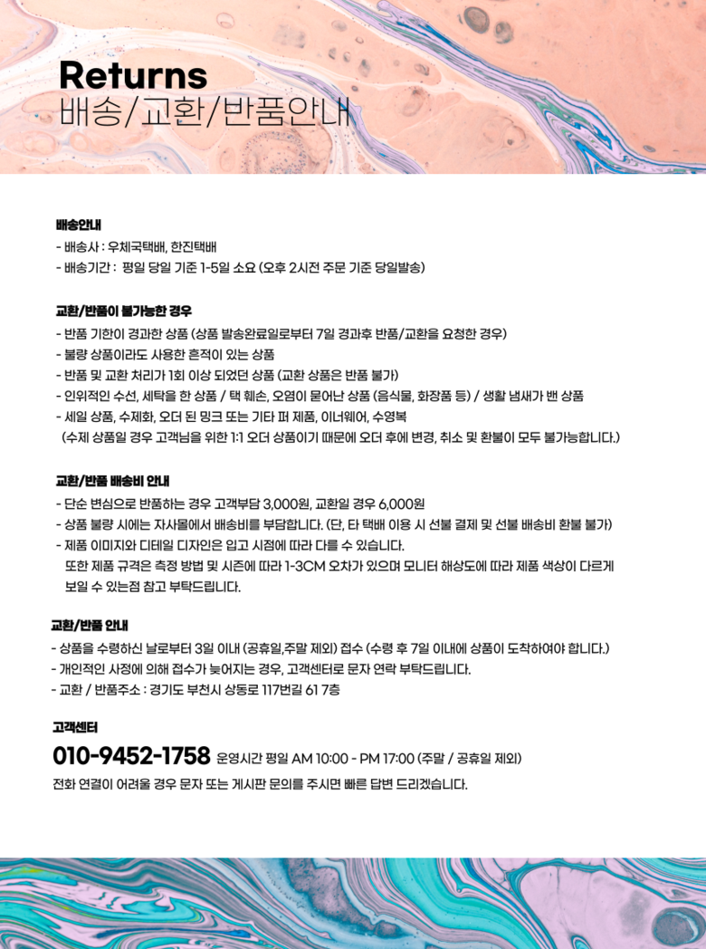 - ㆍ모니터 해상도의 차이로 인해 색상이나 이미지가 실제와 달라, 고객이 단순 변심으로 교환/반품을 무료로 요청하는 경우