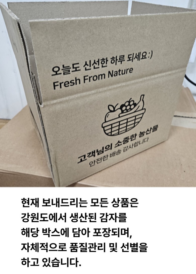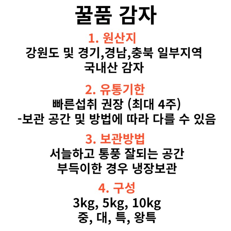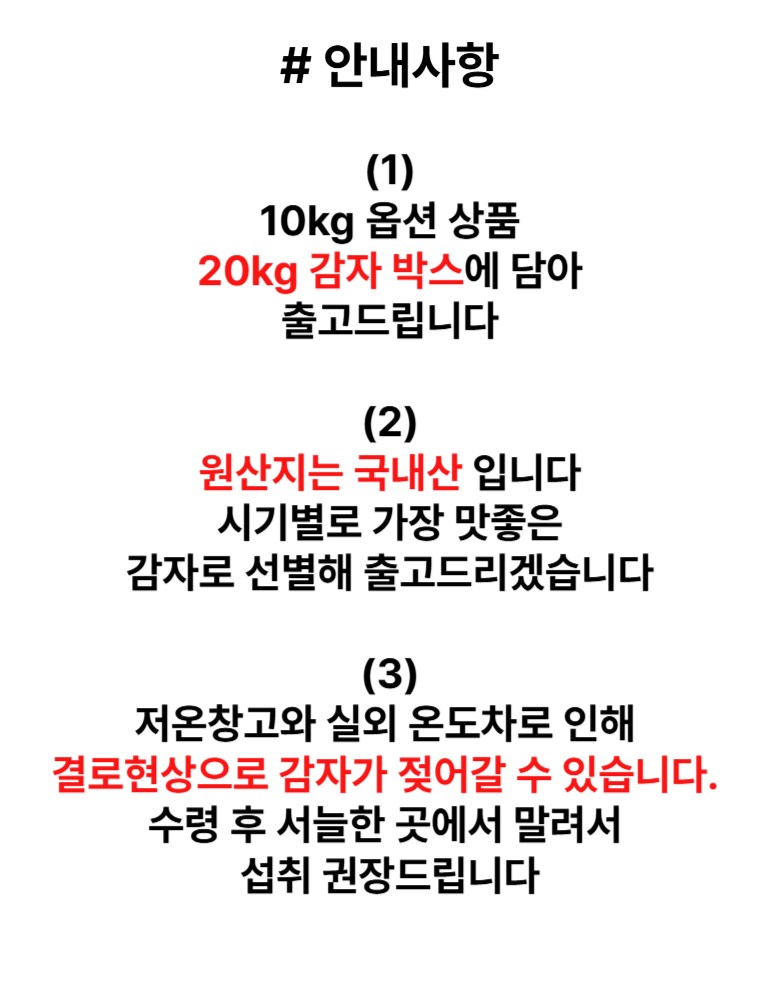 | 품목 또는 명칭 | 국내산 감자 | 포장단위별 내용물의 용량(중량),수량,크기 | 3kg,5kg,10kg |