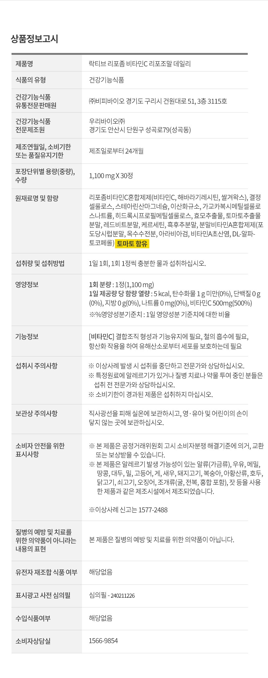 | 소비기한 및 보관방법 | 소비기한(또는 유통기한) : 2026년 07월 24일 이거나 그 이후인 상품<br />제조년월일 : 2024년 07월 25일 이후인 제조상품<br />보관방법: 컨텐츠 참조 | 포장단위별 내용물의 용량(중량), 수량 | 30정 x 2개 |