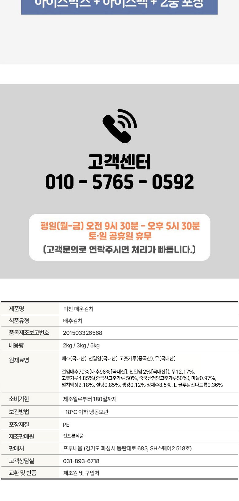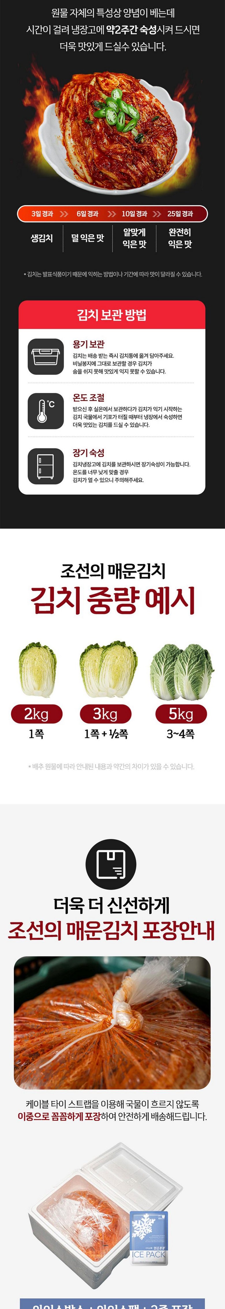 | 포장단위별 내용물의 용량(중량), 수량 | 2kg / 3kg / 5kg | 원재료명 및 함량 | 배추(국내산), 천일염(국내산), 고춧가루(중국산), 무(국내산) / 절임배추70%(배추98%[국내산], 천일염 2%[국내산]) , 무12.17%, 고춧가루4.85%(중국산고춧가루 50%, 중국산청양고춧가루50%), 마늘0.97%, 멸치액젓2.18%, 설탕0.85%, 생강0.12% 정제수8.5%, L-글루탐산나트륨0.36% |