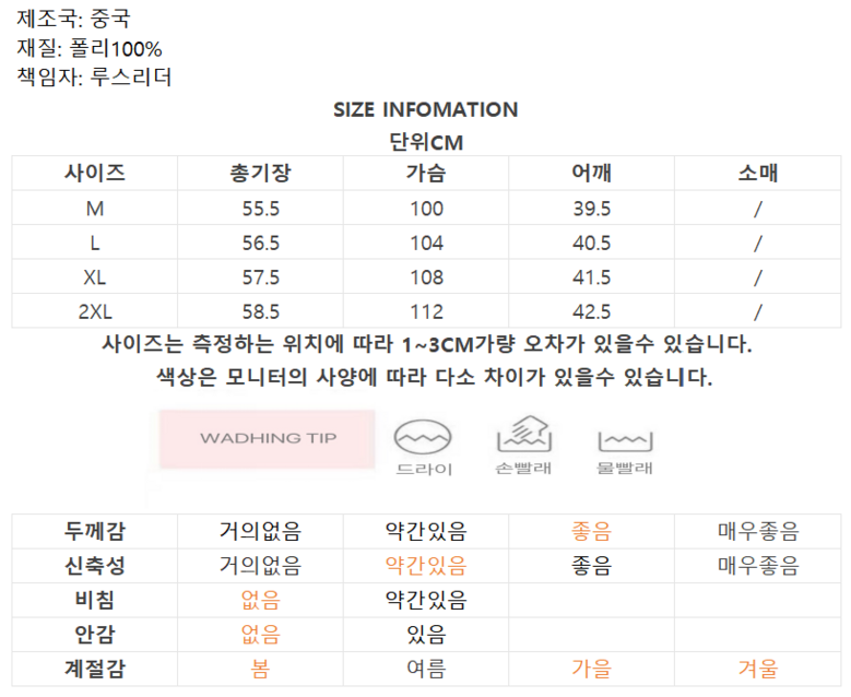 | 제조국 | 중국 | 세탁방법 및 취급시 주의사항 | 상품 상세페이지 참조 |