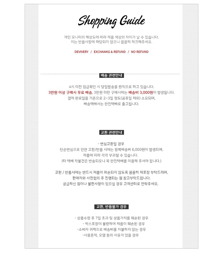 - ㆍ모니터 해상도의 차이로 인해 색상이나 이미지가 실제와 달라, 고객이 단순 변심으로 교환/반품을 무료로 요청하는 경우