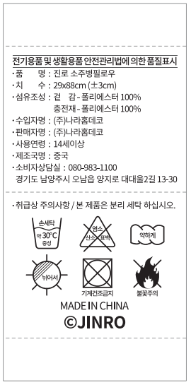 | 제품 소재 | 겉감 : 폴리에스터 100% 충전재 : 폴리에스터 100% | 색상 | 혼합색상 |