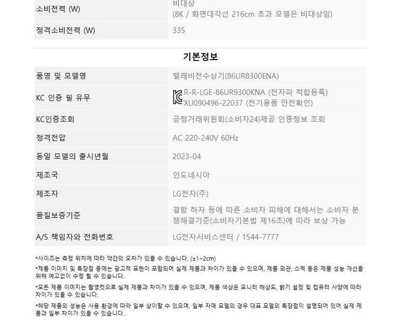 | 품명 및 모델명 | LG전자 4K 울트라 HD TV 217cm(86인치) 86UR8300ENA | KC 인증정보 | XU090496-22037A, R-R-LGE-86UR9300KNA,R-C-LGE-LGSBWAC95 |