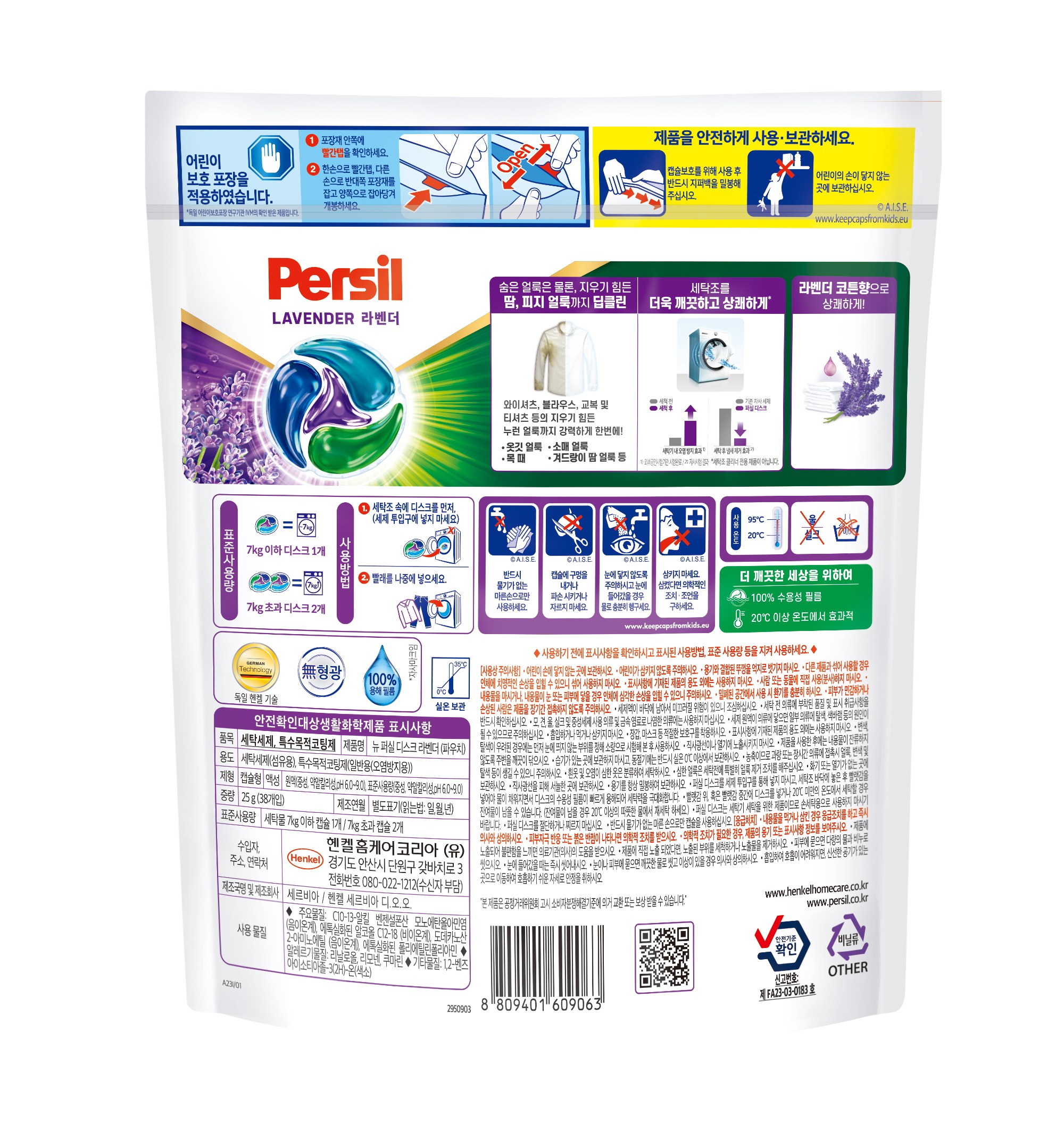 | 품목 및 제품명 | 세탁세제, 특수목적코팅제 / 뉴 퍼실 디스크 라벤더 (파우치) | 용도(표백제의 경우 계열을 함께표시) 및 제형 | 세탁세제(섬유용), 특수목적코팅제(일반용(오염방지용)) / 캡슐형 |