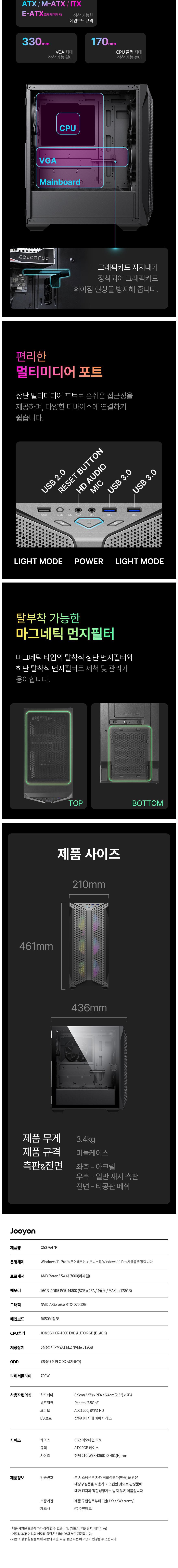 | 품명 및 모델명 | 주연테크 2024 리오나인 터보 라이젠5 라이젠 7000 시리즈 지포스/CG27647 | KC 인증정보 | 본품:전자파 적합성평가(인증)를 받은 내장구성품을 사용하여 조립한 것으로 완성품에 대한 전자파 적합성평가는 받지 않음/전원공급장치:KCC-REI-HMM-CLASSICII700W,XU100157-13003A/전원코드:SU04247-19001 |