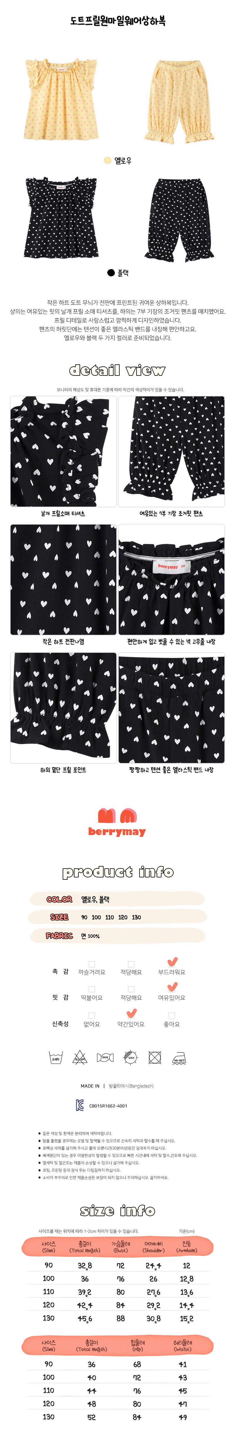 | 품명 및 모델명 | 베리메이 여아용 도트 프릴 원마일 웨어 상하복 세트 | KC 인증정보 | CB015R1662-4001 |