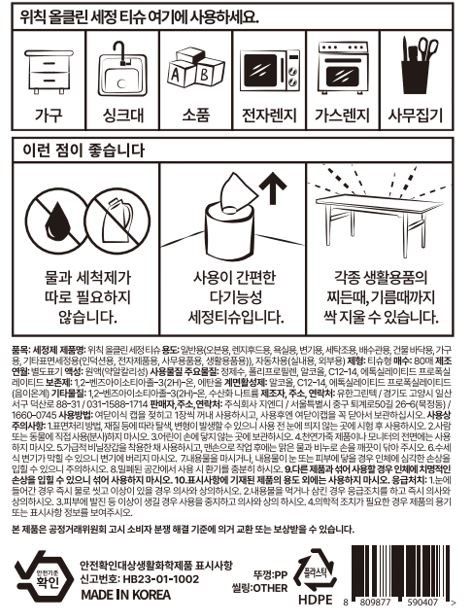 | 품목 및 제품명 | 세정제 / 위칙 올클린 세정 티슈 | 용도(표백제의 경우 계열을 함께표시) 및 제형 | 일반용(오븐용),일반용(렌지후드용),일반용(욕실용),일반용(변기용),일반용(세탁조용),일반용(배수관용),일반용(건물 바닥용),일반용(가구용),일반용(기타표면세정용(인덕션용, 전자제품용, 사무용품용, 생활용품용)),자동차용(실내용),자동차용(외부용) / 티슈형 |