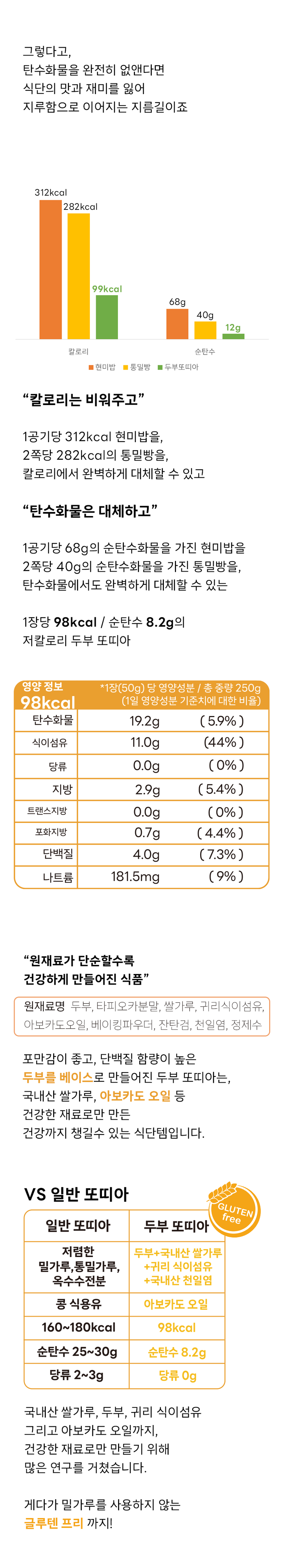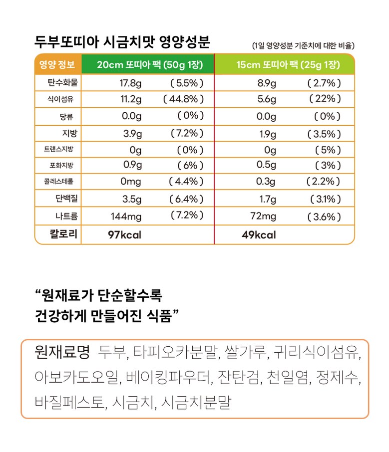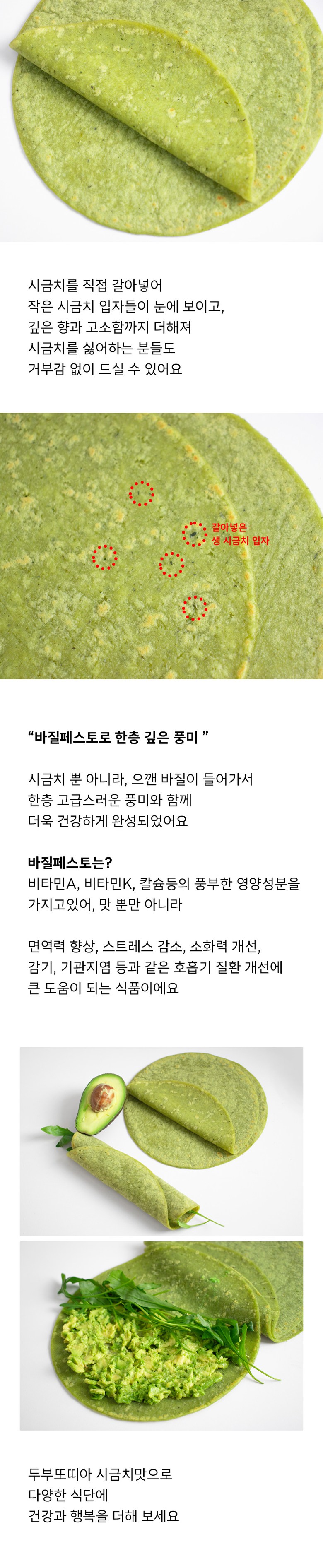 | 포장단위별 내용물의 용량(중량), 수량 | 150g, 250g - 1팩당 5장 입 | 원재료명 및 함량 | 두부(콩:수입산),쌀가루(국내산),타피오카전분(태국산),귀리식이섬유,아보카도오일,잔탄검,베이킹파우더,천일염,정제수,바질페스토,시금치,시금치분말 |