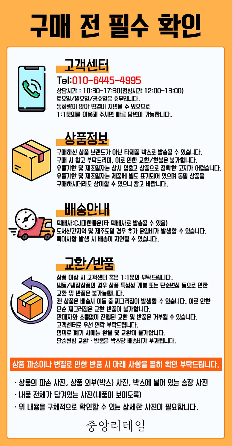 - ㆍ교환/반품에 관한 일반적인 사항은 판매자가 제시사항보다 관계법령이 우선합니다.