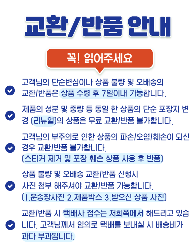 | 교환/반품 신청 기준일 | ㆍ단순변심에 의한 교환/반품은 제품 수령 후 7일 이내까지, 교환/반품 제한사항에 해당하지 않는 경우에만 가능 (배송비용과 교환/반품 비용 왕복배송비 고객부담) ㆍ상품의 내용이 표시·광고의 내용과 다른 경우에는 상품을 수령한 날부터 3개월 이내, 그 사실을 안 날 또는 알 수 있었던 날부터 |