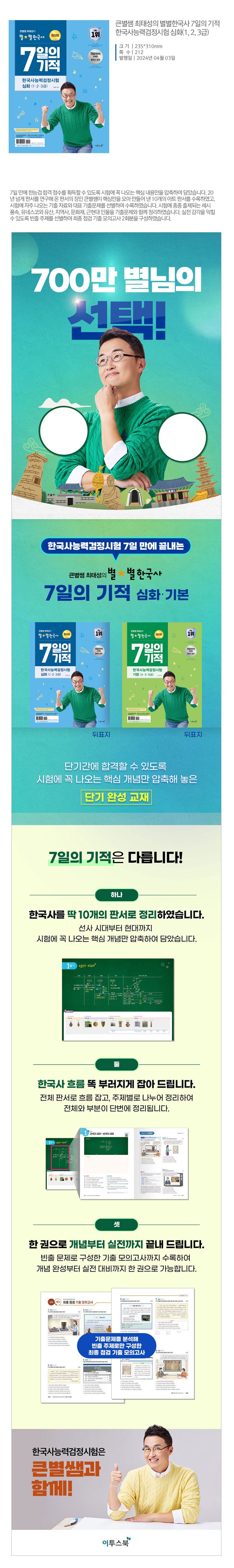 | 도서명 | 큰별쌤 최태성의 별별한국사 7일의 기적 한국사능력검정시험 심화 (1, 2, 3급) | 저자, 출판사 | 최태성, 이투스북 |