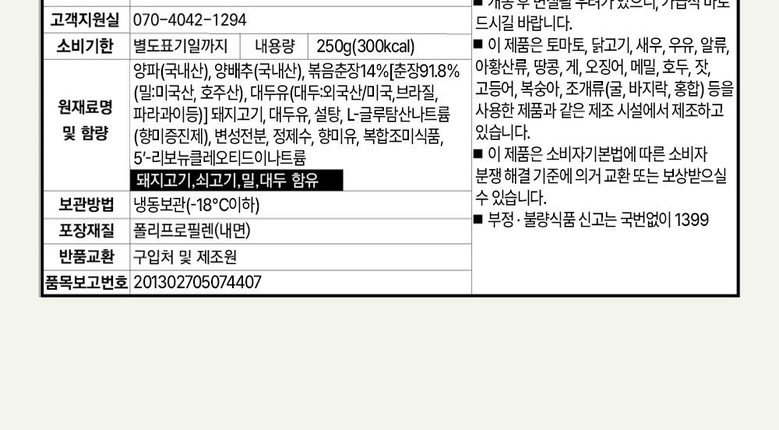 | 제조연월일, 소비기한 또는 품질유지기한 | 고객센터 문의요청 부탁드립니다. | 세부 품목군별 표시사항 | 상품 상세페이지 참조 |