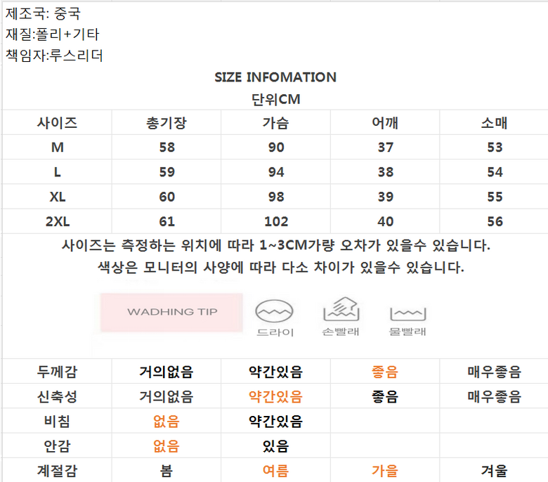 | 제조국 | 중국 | 세탁방법 및 취급시 주의사항 | 상품 상세페이지 참조 |