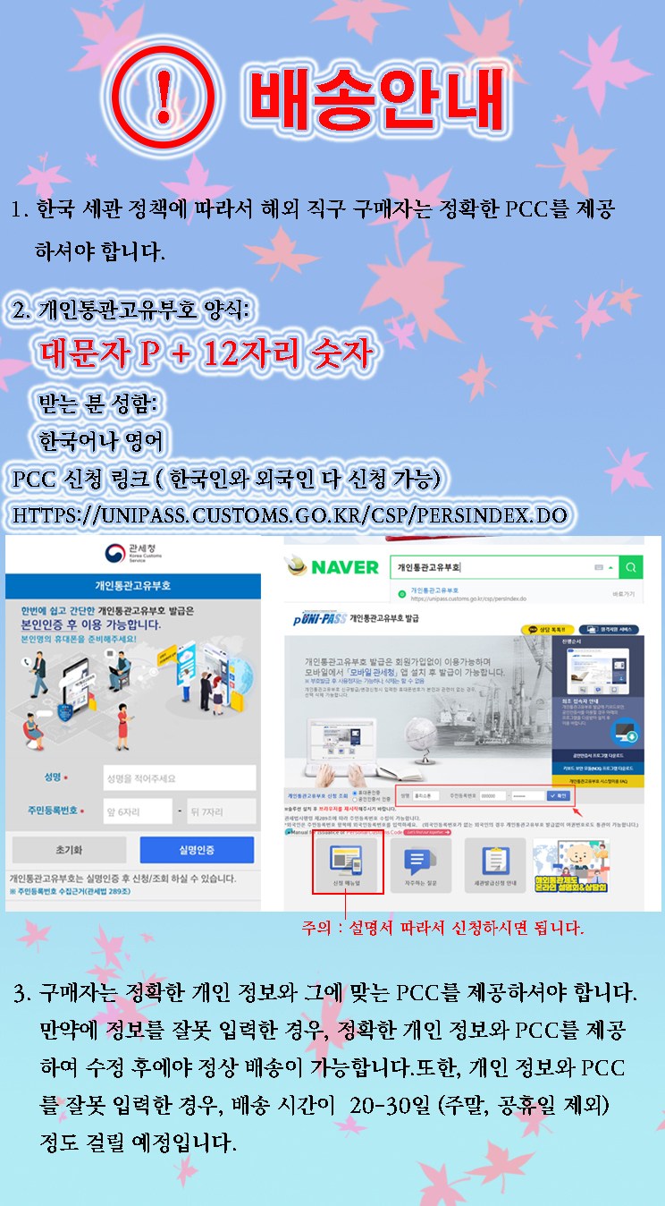 - 법규 개정에 따라 개인통관고유부호 검증 절차가 강화되었습니다.
