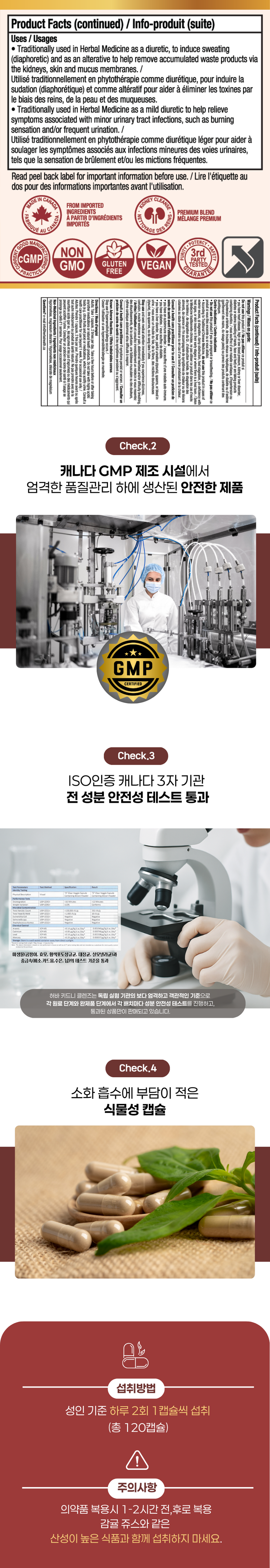 | 원료명 및 함량 | 콩팥 신장 클렌즈 120식물성캡슐 | 영양정보 | 우바우르시잎 150mg (600mg/4배추출 기준)주니퍼베리 50mg쐐기풀추출물 100mg (400mg/4배 농축 기준)생갈뿌리 100mg(400mg/4배농축기준)마쉬멜로뿌리 100mg우엉 뿌리 300mg (1200mg/4배농축기준)아스파라거스 뿌리 추출물 200mg파슬리 리프 파우더 100mg(하루 섭취량 기준) |