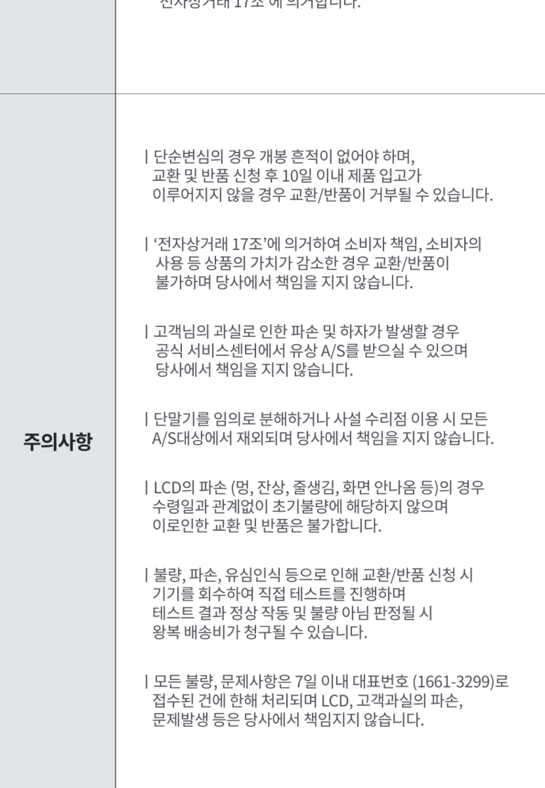 | 교환/반품 신청 기준일 | ㆍ단순변심에 의한 교환/반품은 제품 수령 후 7일 이내까지, 교환/반품 제한사항에 해당하지 않는 경우에만 가능 (배송비용과 교환/반품 비용 왕복배송비 고객부담) ㆍ상품의 내용이 표시·광고의 내용과 다른 경우에는 상품을 수령한 날부터 3개월 이내, 그 사실을 안 날 또는 알 수 있었던 날부터 |