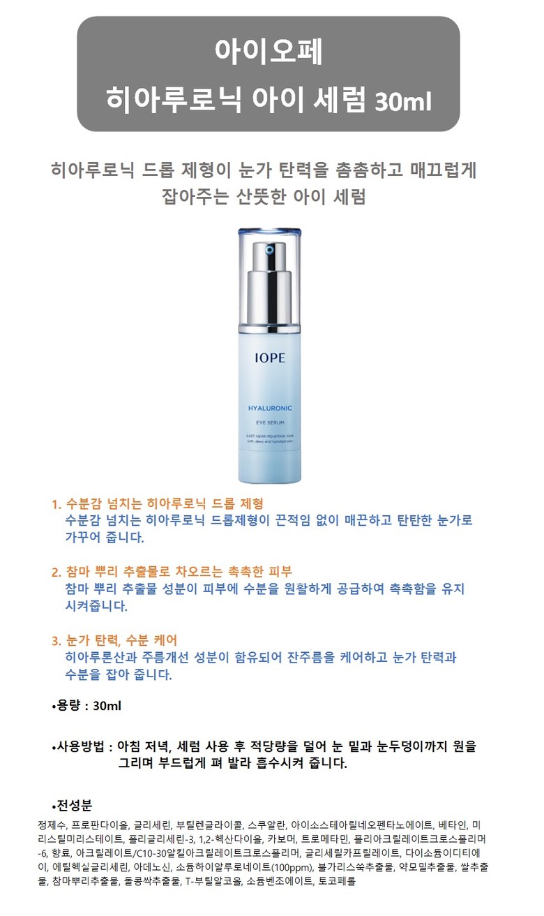 | 용량(중량) | 30ml + 30ml | 제품 주요 사양 | 모든피부 |