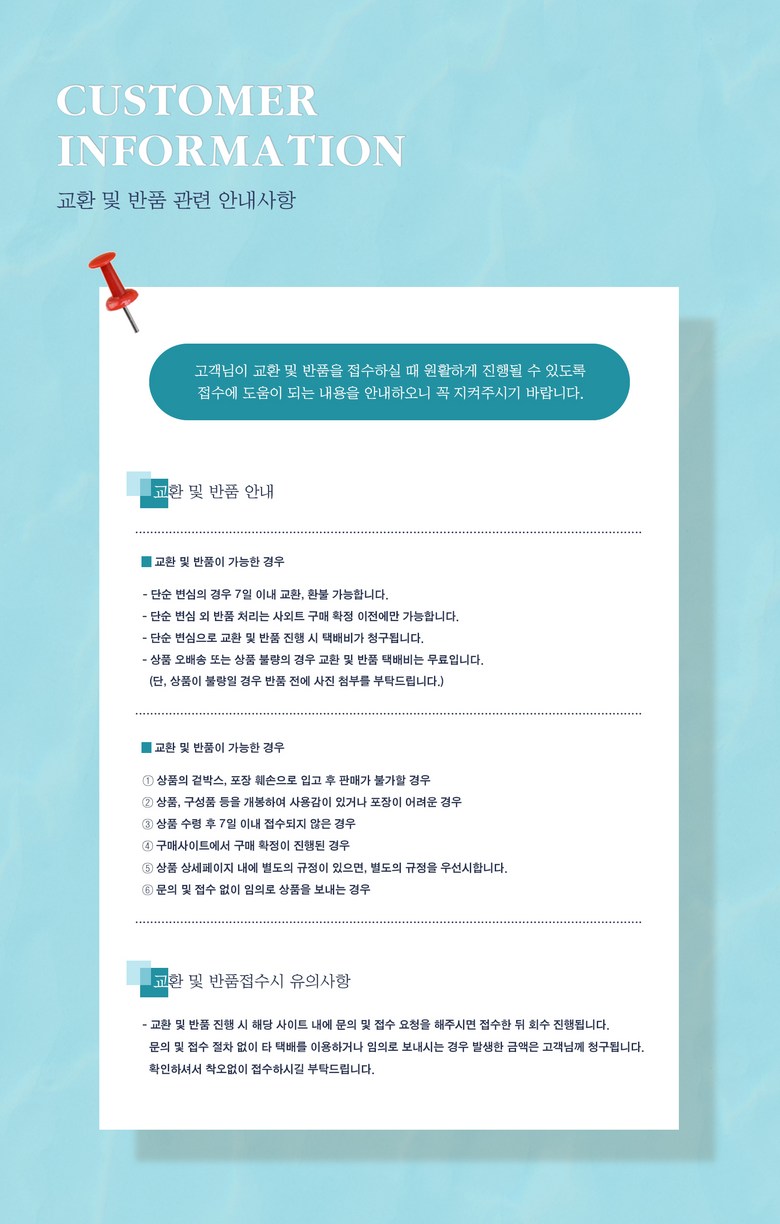 - ㆍ교환/반품에 관한 일반적인 사항은 판매자가 제시사항보다 관계법령이 우선합니다.