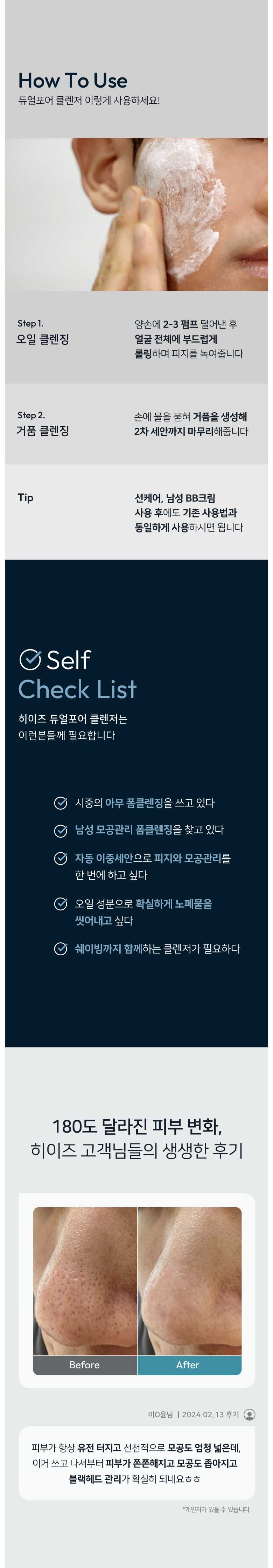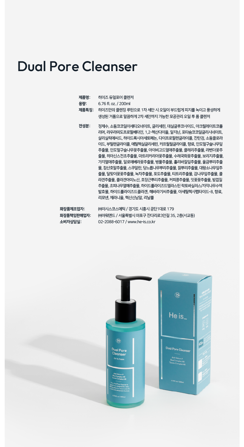 | 사용기한 또는 개봉 후 사용기간 | 상품 상세페이지 참조 | 사용방법 | 1. 2-3회 펌핑하여 얼굴 전체에 롤링하며 피지를 녹여줍니다. (1차세안) 2. 손에 물을 묻혀 얼굴을 세안하면 됩니다. (2차세안) |