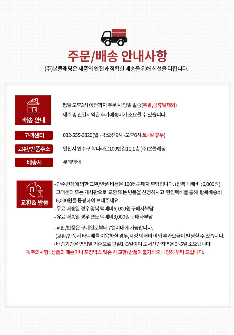 - ㆍ모니터 해상도의 차이로 인해 색상이나 이미지가 실제와 달라, 고객이 단순 변심으로 교환/반품을 무료로 요청하는 경우