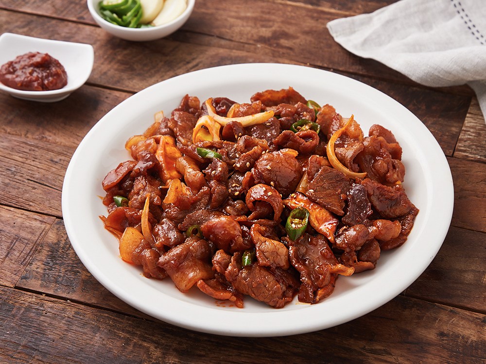고기를 손질하고 양념에 재울 필요 없이, 팬에 넣고 볶아주면 완성되는 제육볶음이에요. 돼지고기 목전지에 양념이 고루 배어, 매콤한 감칠맛이 돋보이지요. 입에 넣으면, 쫄깃쫄깃한 식감 덕분에 자꾸만 손이 갈 거예요. 다양한 쌈 채소를 준비해 함께 드시면 더욱 맛있답니다.