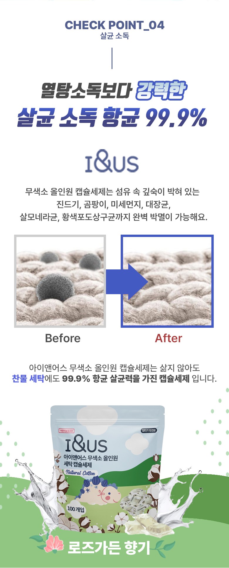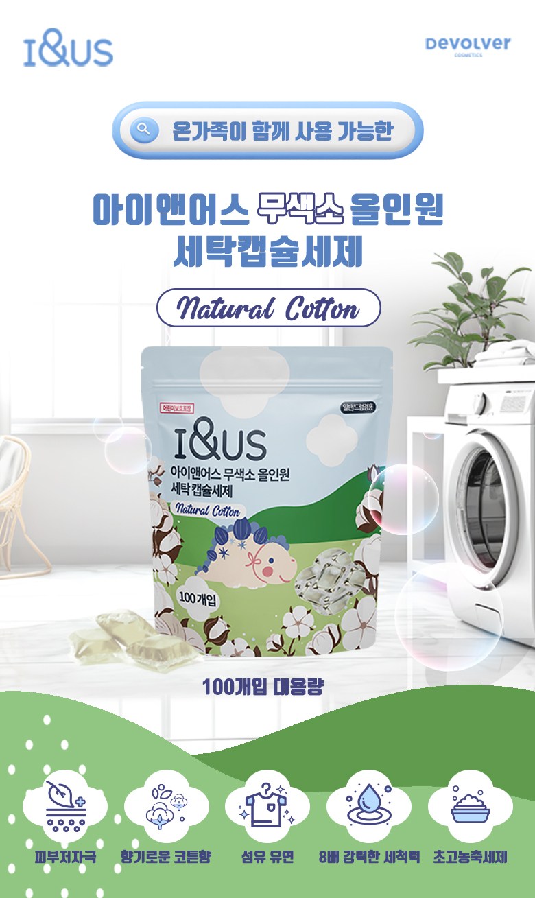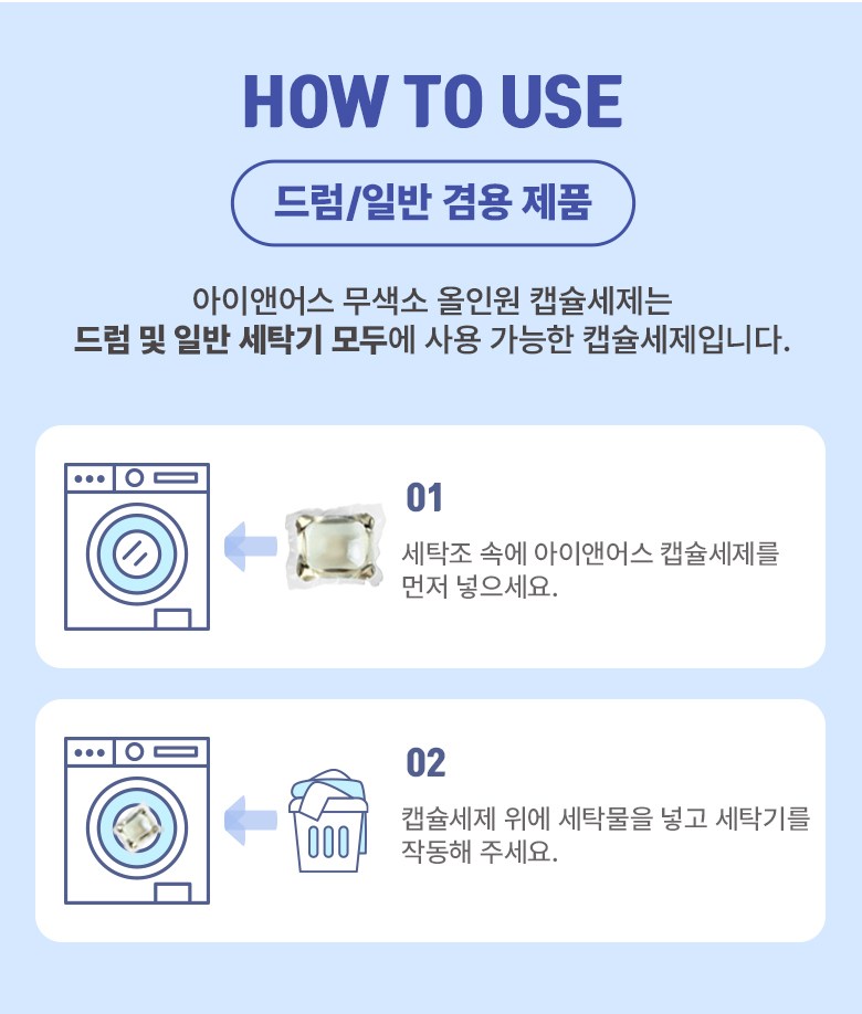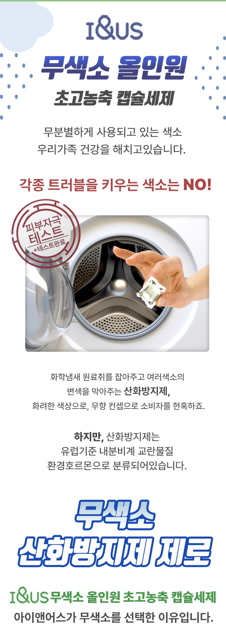 | 품목 및 제품명 | 아이앤어스 무색소 올인원 캡슐세제 100개입 | 용도(표백제의 경우 계열을 함께표시) 및 제형 | 섬유 얼룩제거용 |