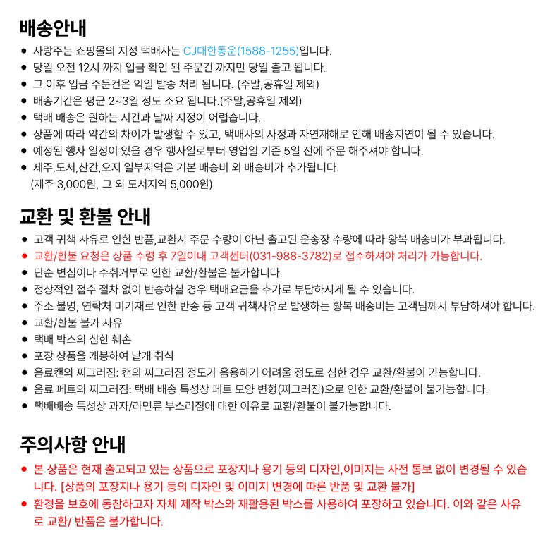 | 배송방법 | 순차배송 | 배송비 | 5,500원 - 도서산간 지역 배송불가 |