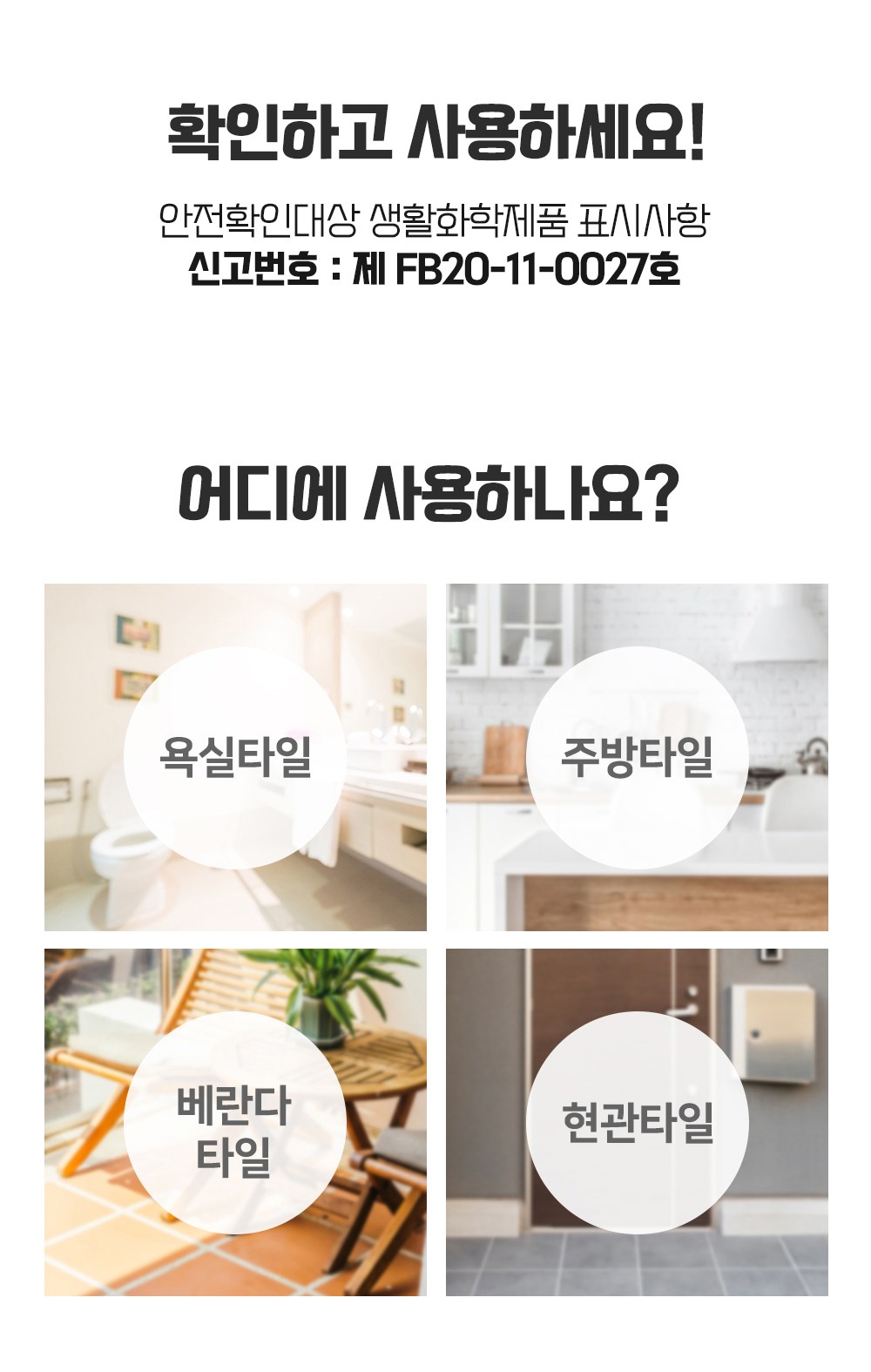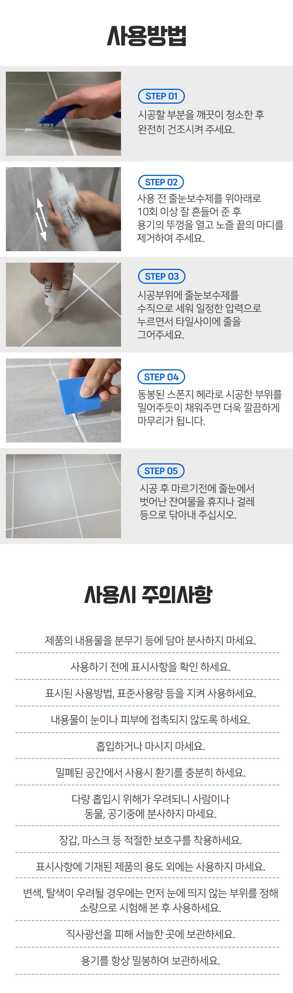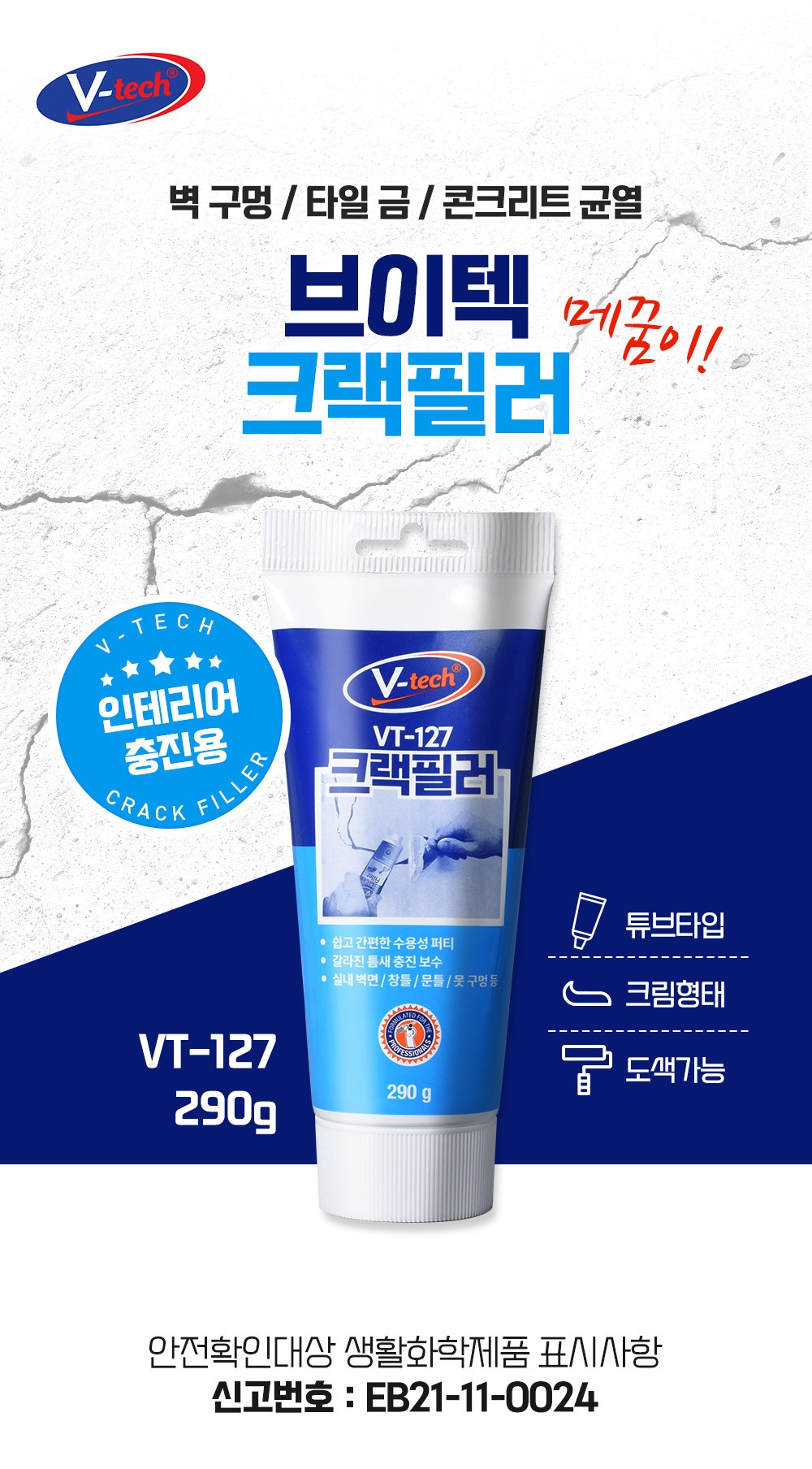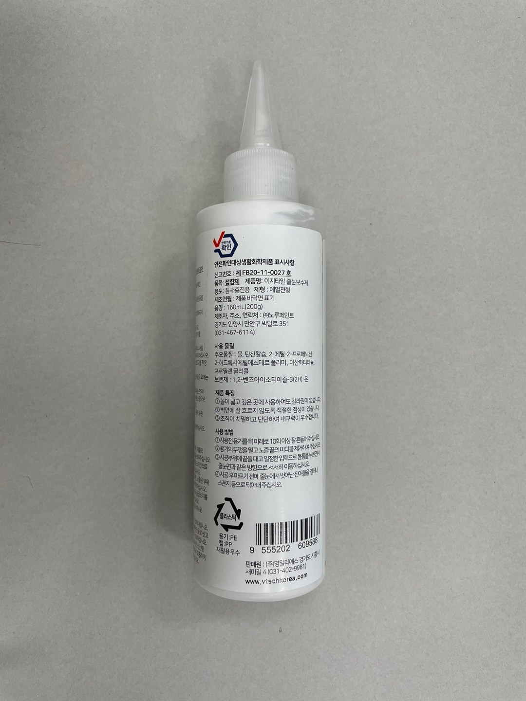 | 품목 및 제품명 | [보수제] 접합제/이지타일 줄눈보수제 [크랙필러] 접합제/크랙필러 | 용도(표백제의 경우 계열을 함께표시) 및 제형 | [보수제] 틈새충진용/에멀션형 [크랙필러] 틈새충진용,이음매접합용,흠집충진용/에멀션형 |