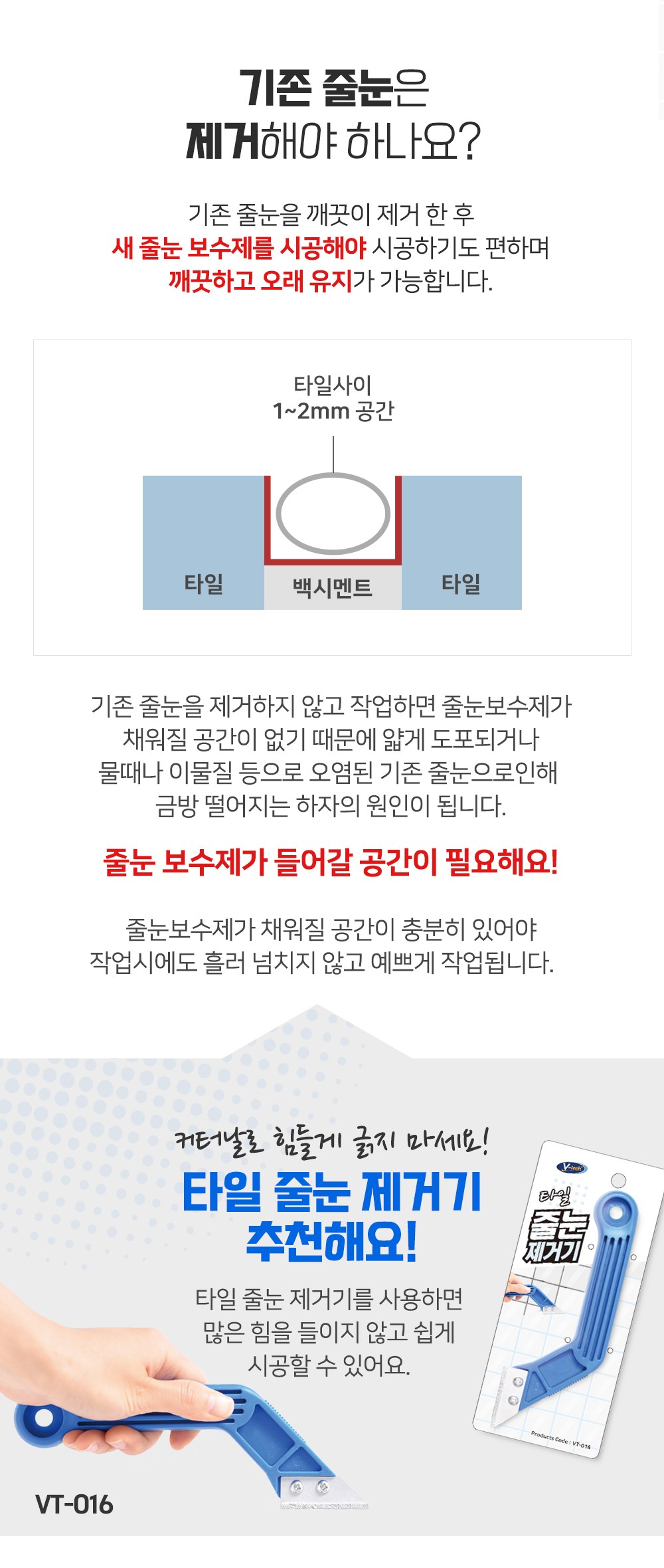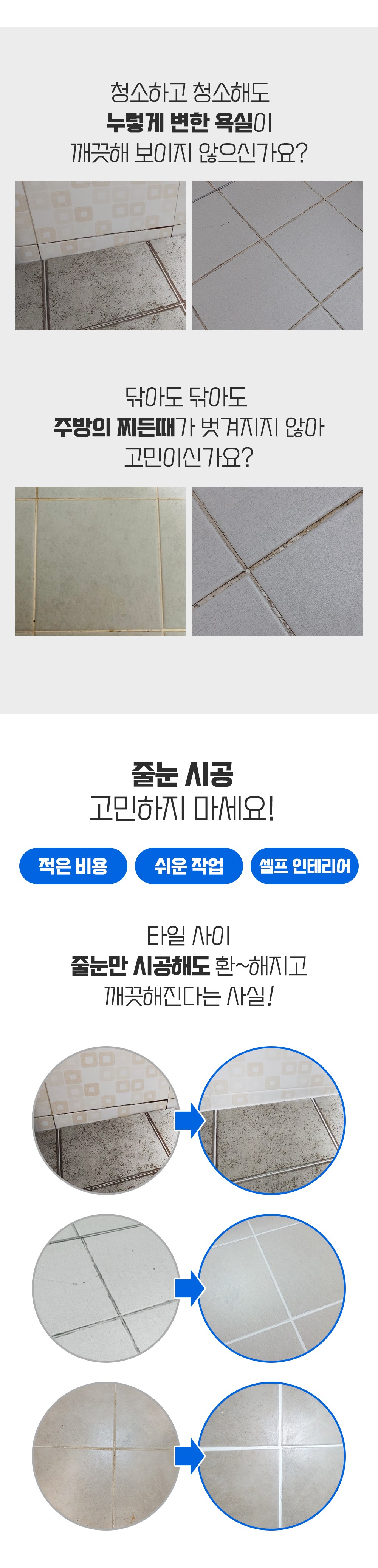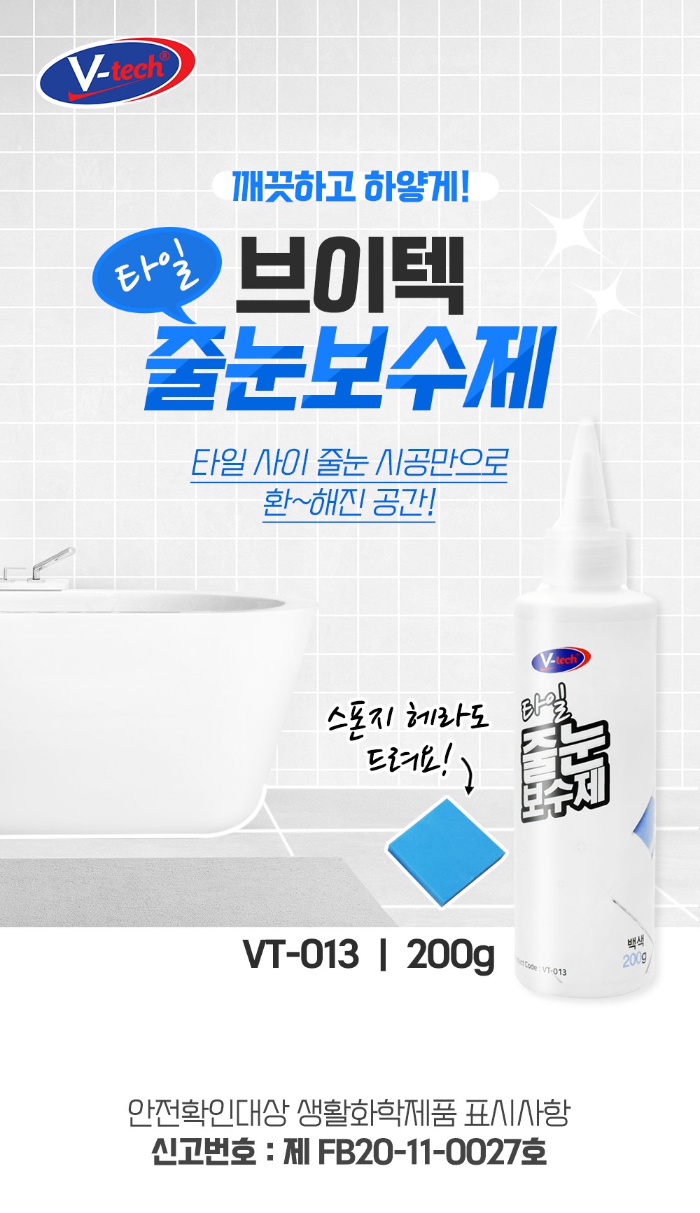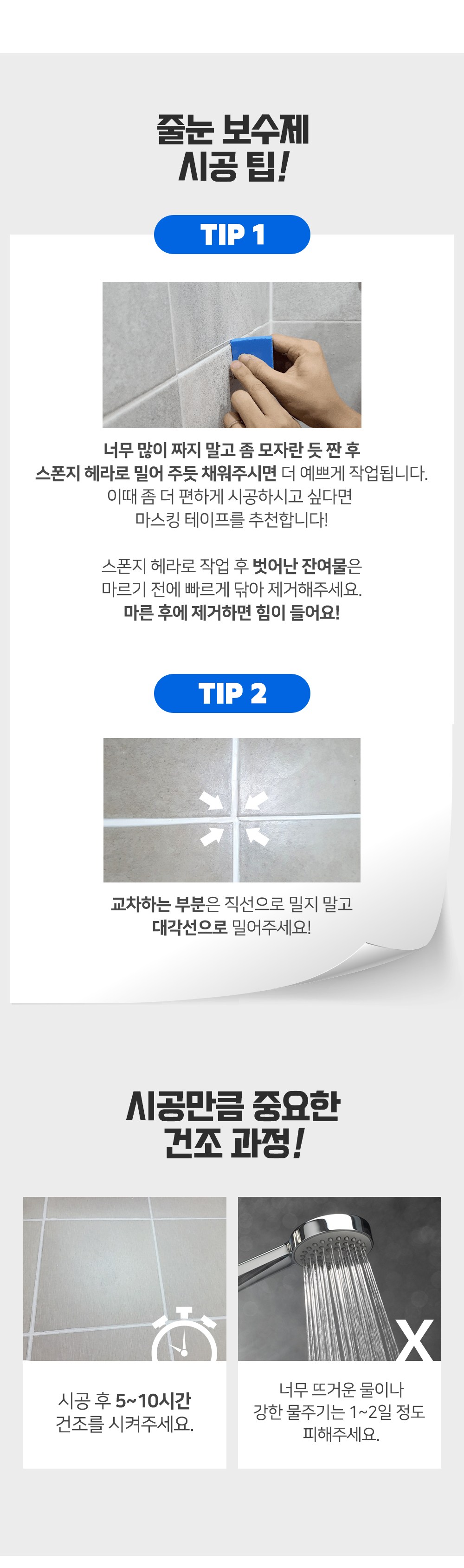 | 품목 및 제품명 | [보수제] 접합제/이지타일 줄눈보수제 [크랙필러] 접합제/크랙필러 | 용도(표백제의 경우 계열을 함께표시) 및 제형 | [보수제] 틈새충진용/에멀션형 [크랙필러] 틈새충진용,이음매접합용,흠집충진용/에멀션형 |