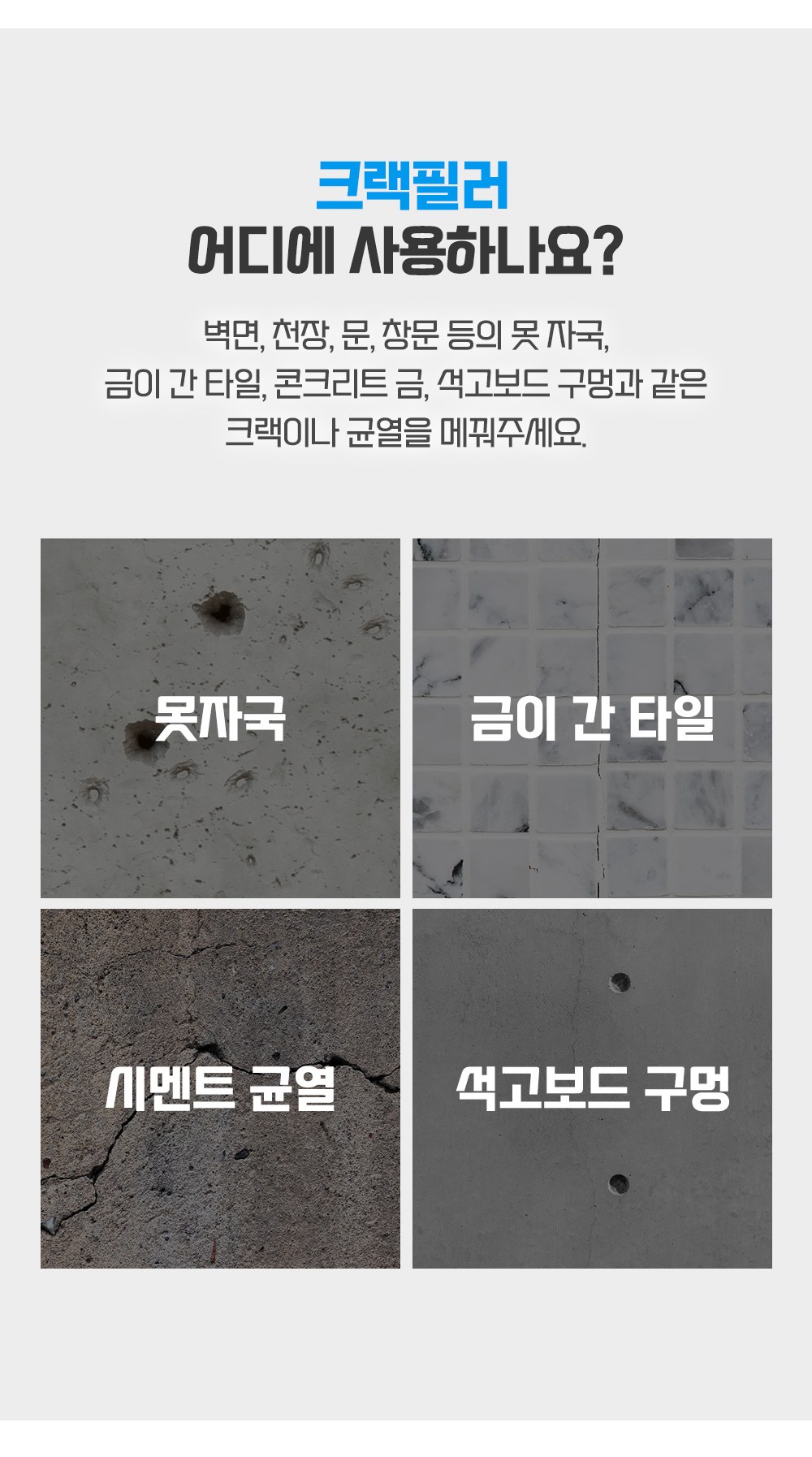 | 제조연월 및 유통기한 (유통기한의 경우 해당 없는 제품은 생략 가능) | 본 상품은 해당 물류센터 직발송 상품인 관계로 해당 정보가 매번 변경되어 정확한 정보제공이 어렵습니다. 관련 사항은 쿠팡고객센터(1577-7011)로 문의 바랍니다. | 중량∙용량∙매수∙크기 | [보수제] 160 (ml), 1개 [크랙필러] 290(g), 1개 |