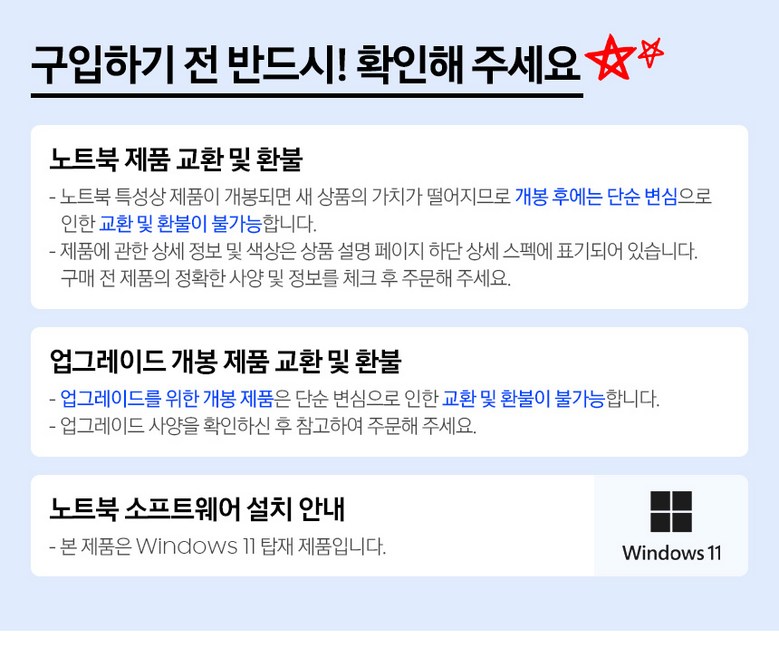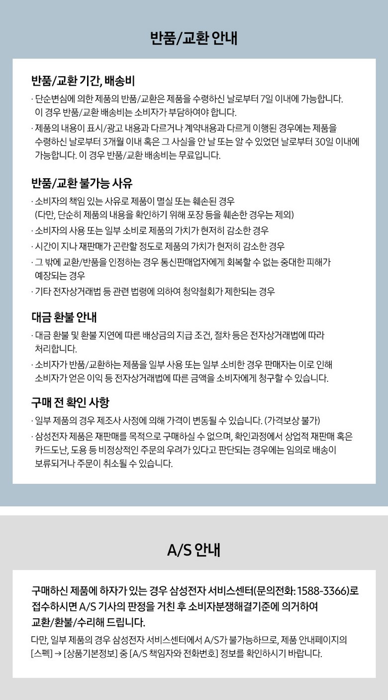 - ㆍ교환/반품에 관한 일반적인 사항은 판매자가 제시사항보다 관계법령이 우선합니다.