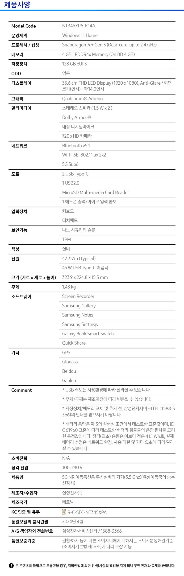 | 품명 및 모델명 | NT345XPA-K14AS / 갤럭시북3 Go | KC 인증정보 | R-R-SEC-NT345XPA |