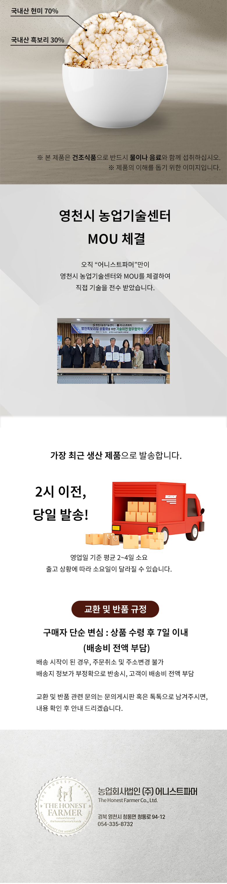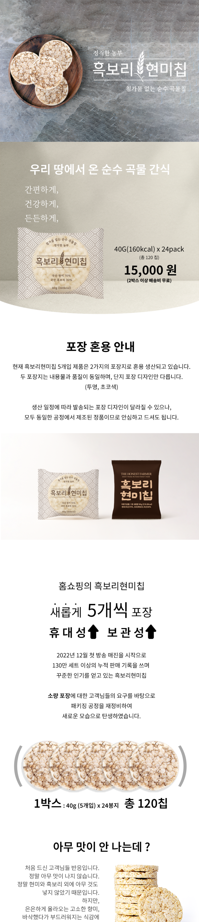 | 포장단위별 내용물의 용량(중량), 수량 | 40g, 24봉지 | 원재료명 및 함량 | 현미(국산) 70%, 흑보리(국산) 30% |