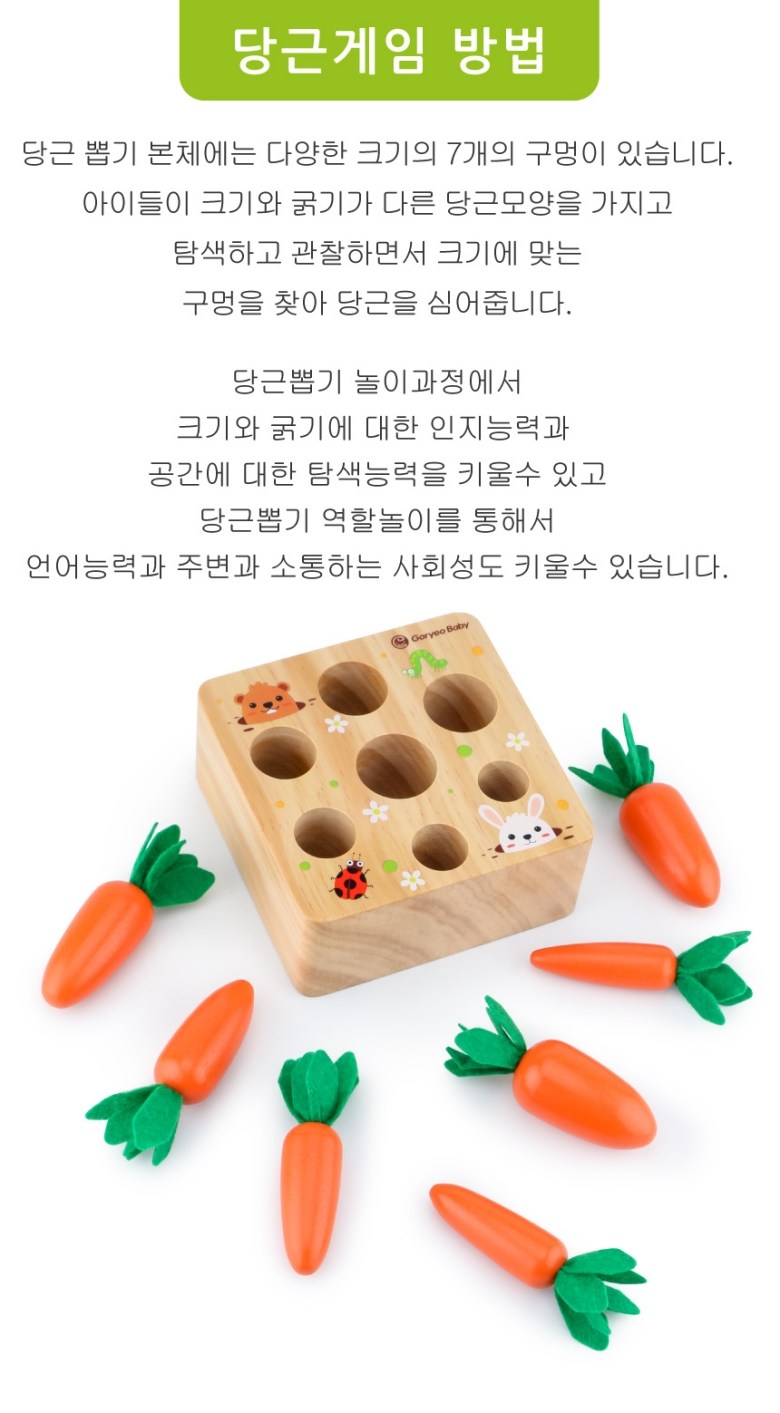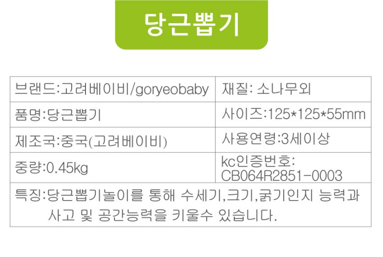 | 품명 및 모델명 | 고려베이비 유아용 소근육 발달 당근 뽑기 원목 장난감 | KC 인증정보 | CB064R2851-0003A |