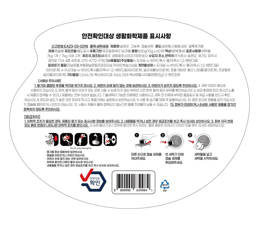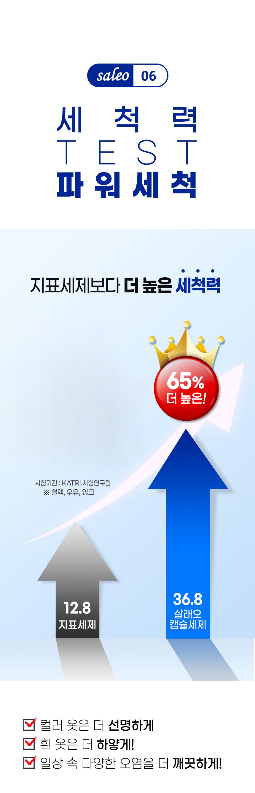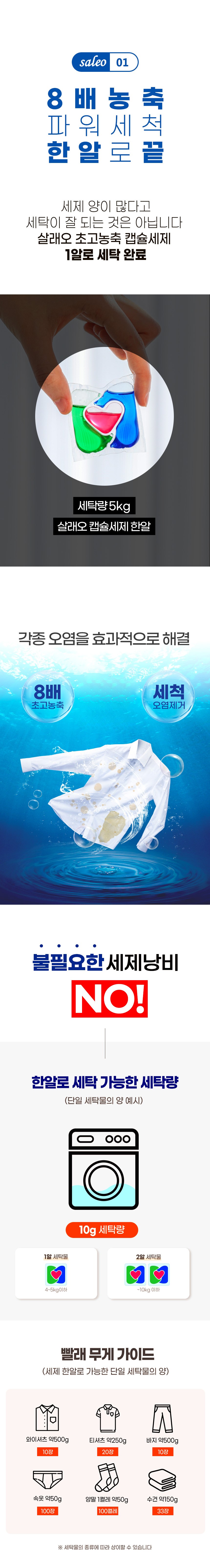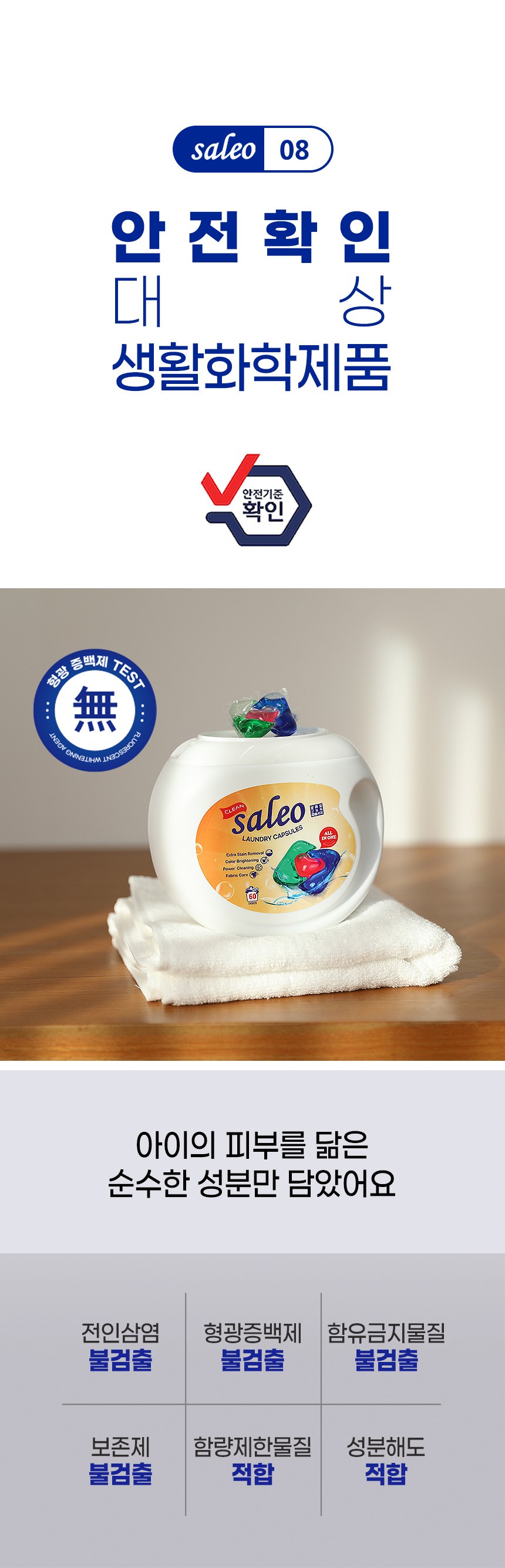 | 품목 및 제품명 | 세탁제품 / 살래오 고농축 캡슐세제 | 용도(표백제의 경우 계열을 함께표시) 및 제형 | 섬유용,신발용,섬유 얼룩제거용 / 캡슐형 |