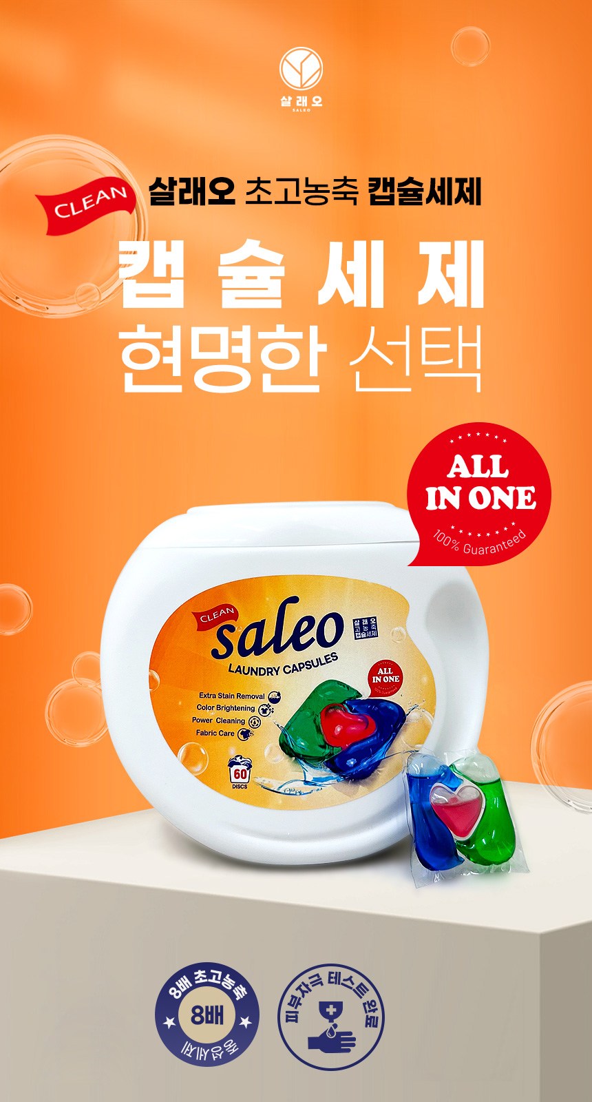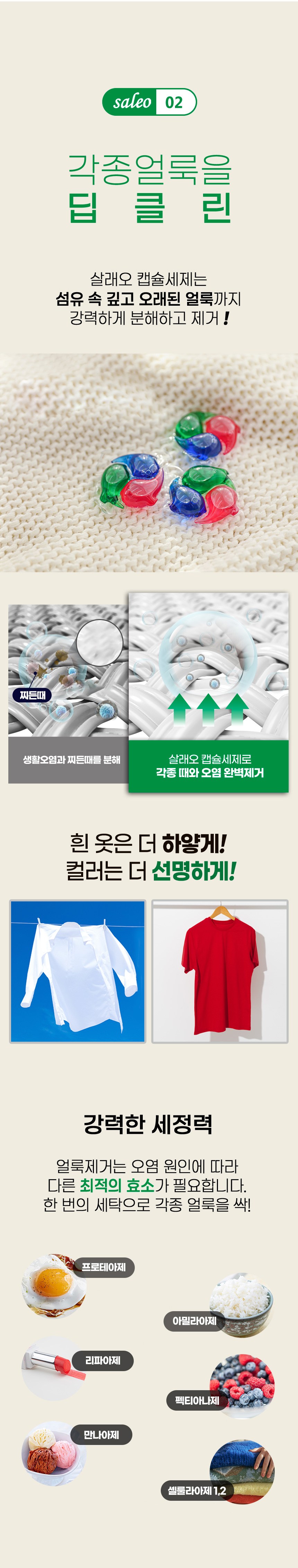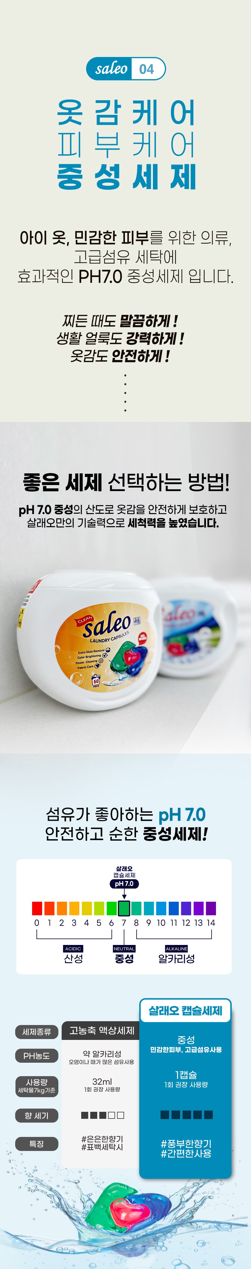 | 품목 및 제품명 | 세탁제품 / 살래오 고농축 캡슐세제 | 용도(표백제의 경우 계열을 함께표시) 및 제형 | 섬유용,신발용,섬유 얼룩제거용 / 캡슐형 |