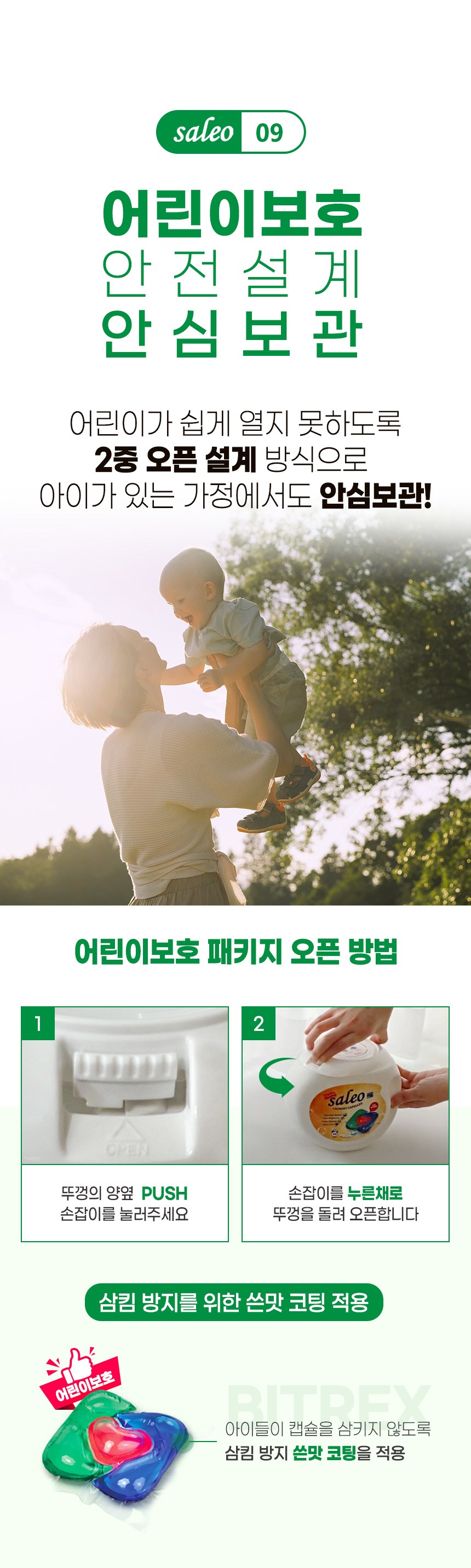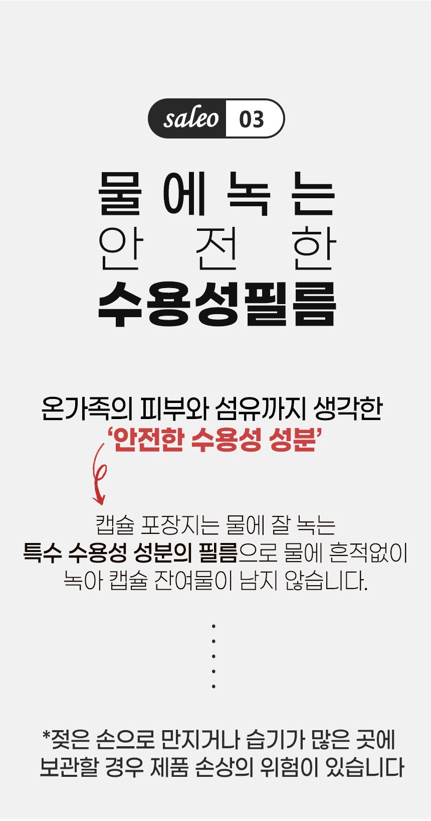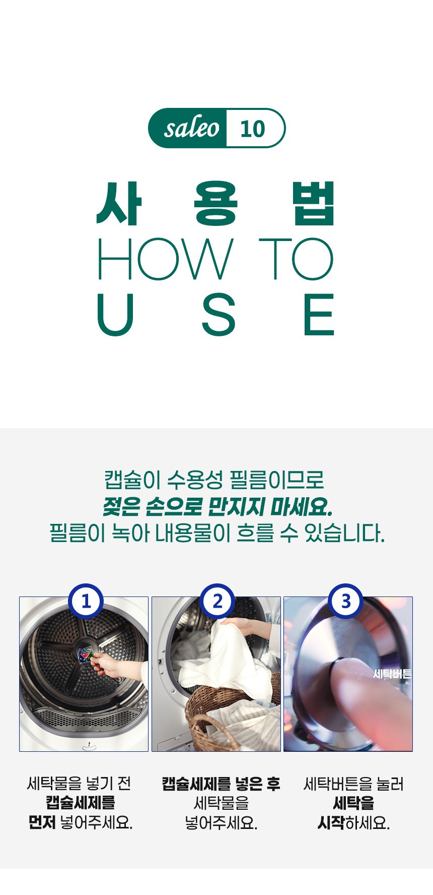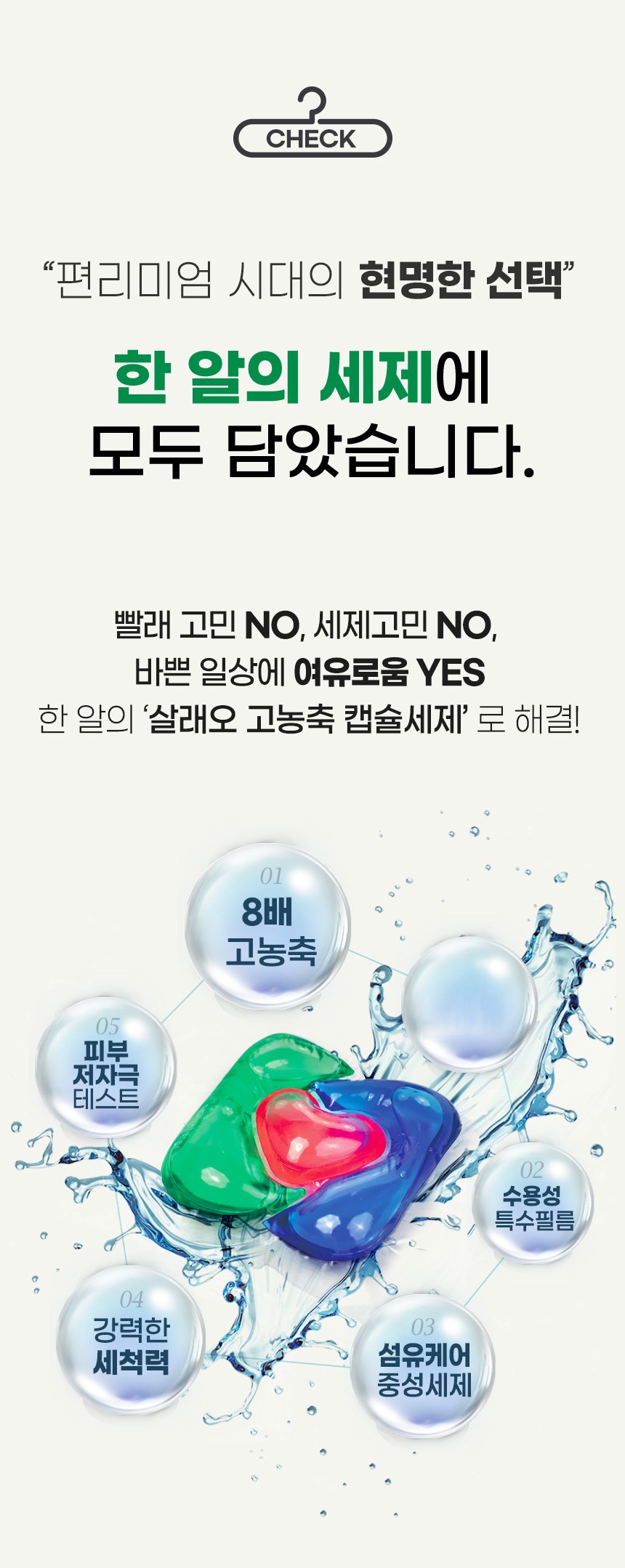 | 품목 및 제품명 | 세탁제품 / 살래오 고농축 캡슐세제 | 용도(표백제의 경우 계열을 함께표시) 및 제형 | 섬유용,신발용,섬유 얼룩제거용 / 캡슐형 |