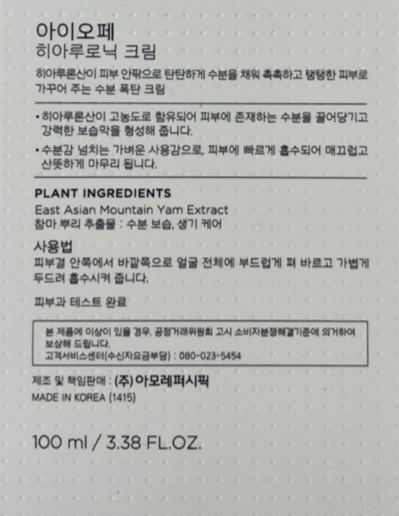 | 품명 및 모델명 | 아이오페 히아루로닉 크림 | 인증/허가 사항 | 해당사항없음 |