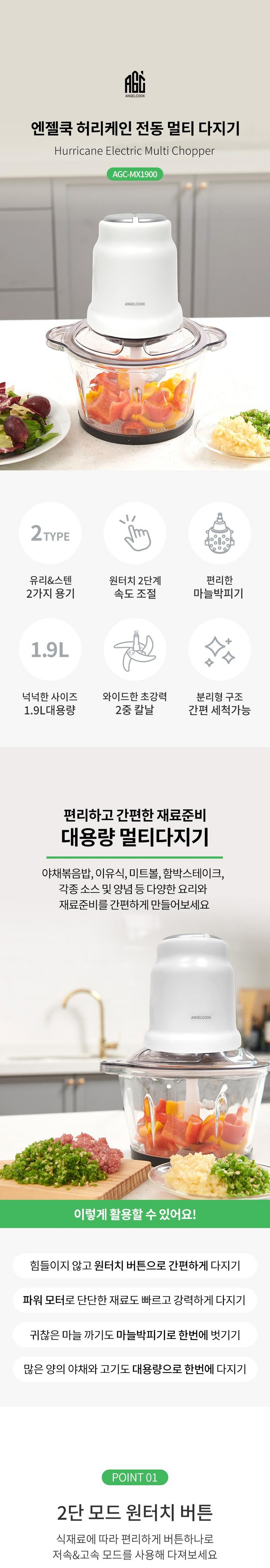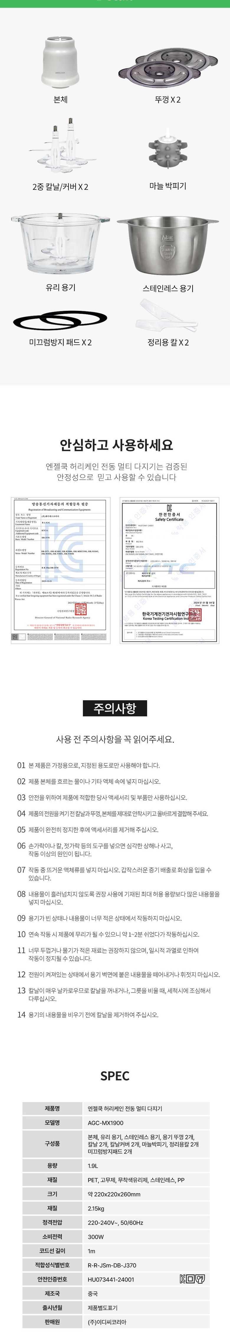 | 품명 및 모델명 | 엔젤쿡 허리케인 전동 멀티 다지기 AGC-MX1900 | KC 인증정보 | 적합성 식별번호: R-R-JSm-DB-J370안전인증번호: HU073441-24001 |