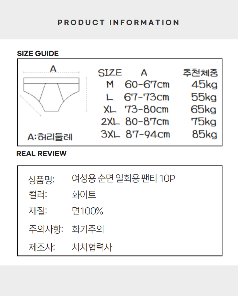 | 제조국 | 중국 | 세탁방법 및 취급시 주의사항 | 일회용팬티 세탁필요없음 |