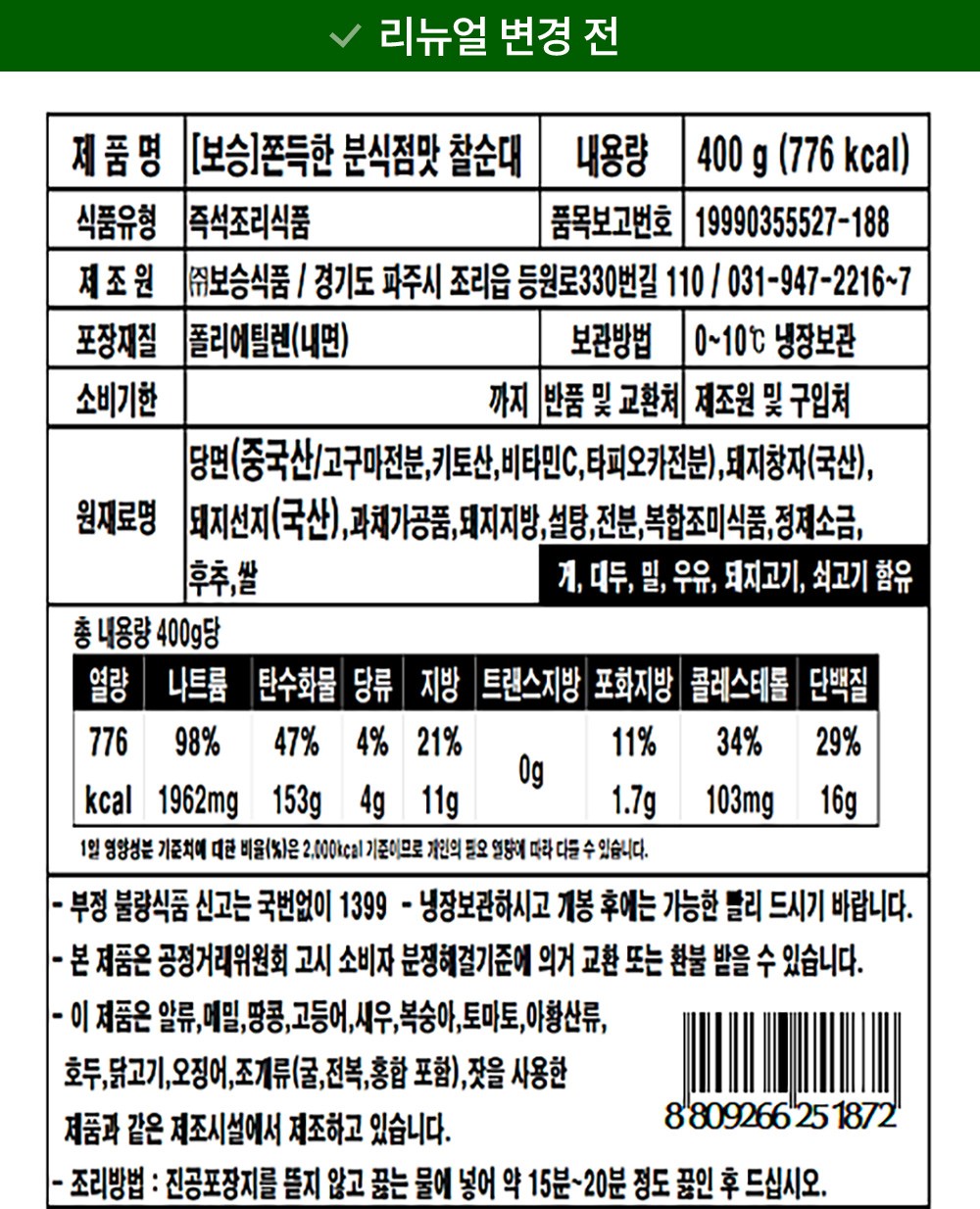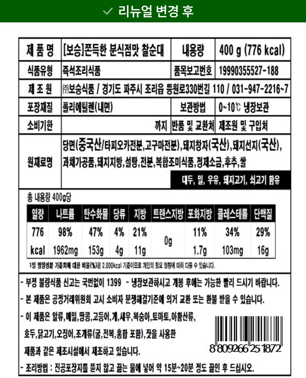 | 포장단위별 내용물의 용량(중량), 수량 | 400g x 2개 | 원재료명 및 함량 | 컨텐츠 참조 |