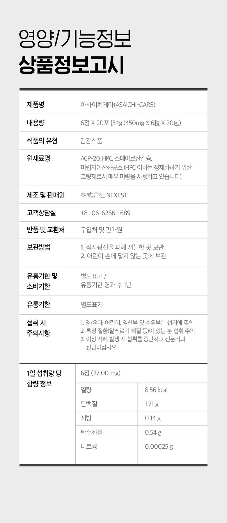 | 원재료명 및 함량 | ACP-20, HPC, 스테아르산칼슘, 미립자이산화규소 | 영양성분 | 상품 상세페이지 참조 |