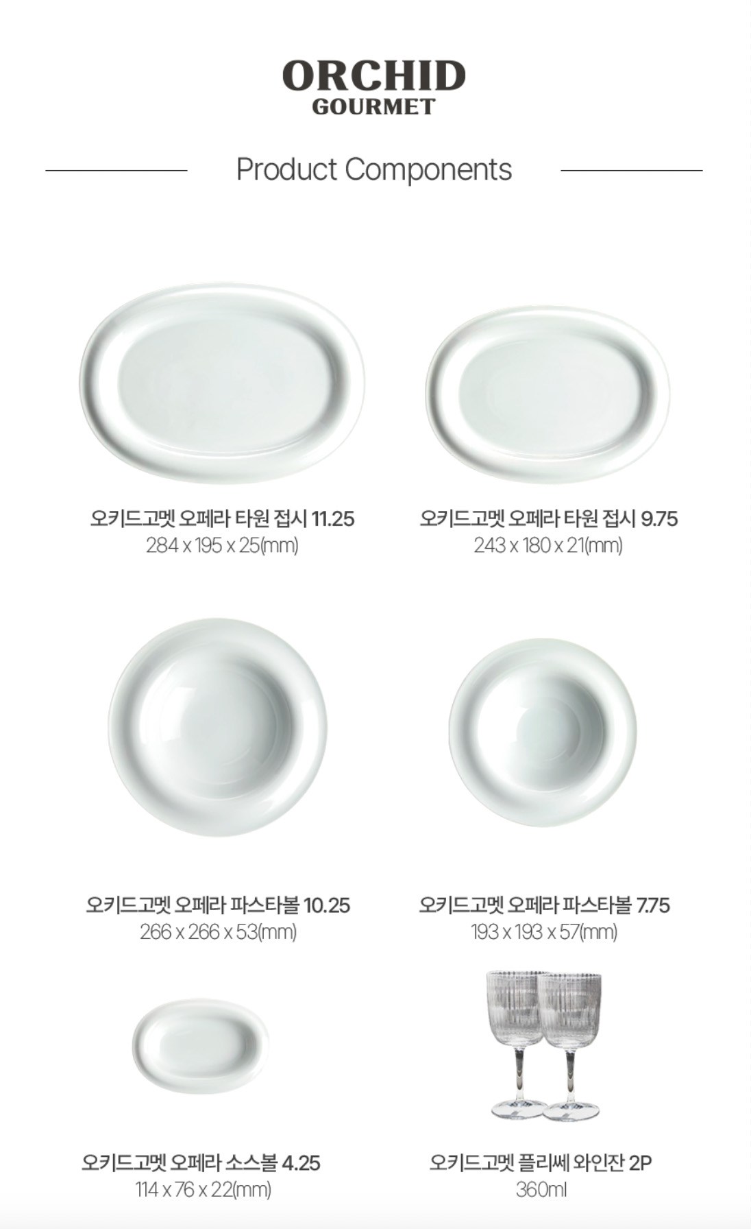 | 구성품 | 타원접시 2종 + 파스타볼 2종 + 소스볼 + 와인잔 2p | 크기 | 컨텐츠참조 |