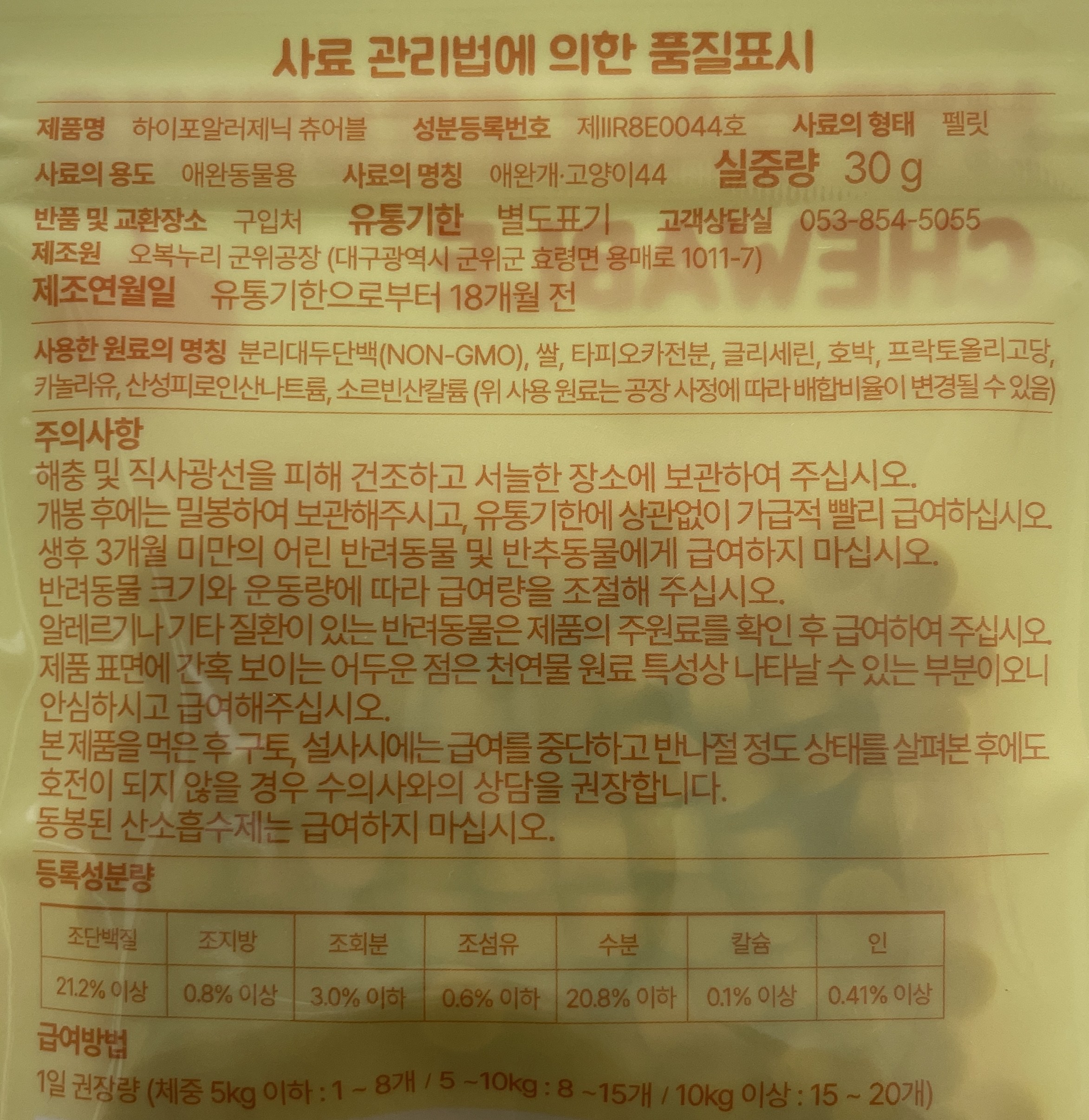 | 품명 및 모델명 | 하이포알러제닉 츄어블 | 인증/허가 사항 | 사료관리법에 따른 성분등록번호 : 컨텐츠 참조 |