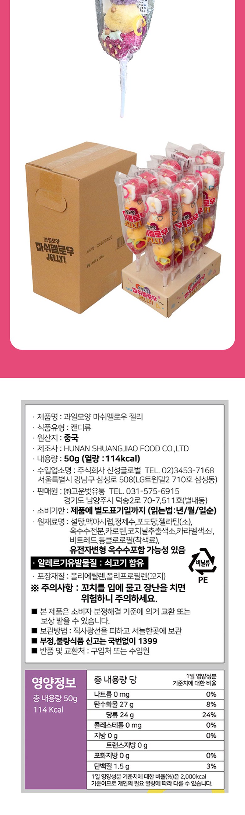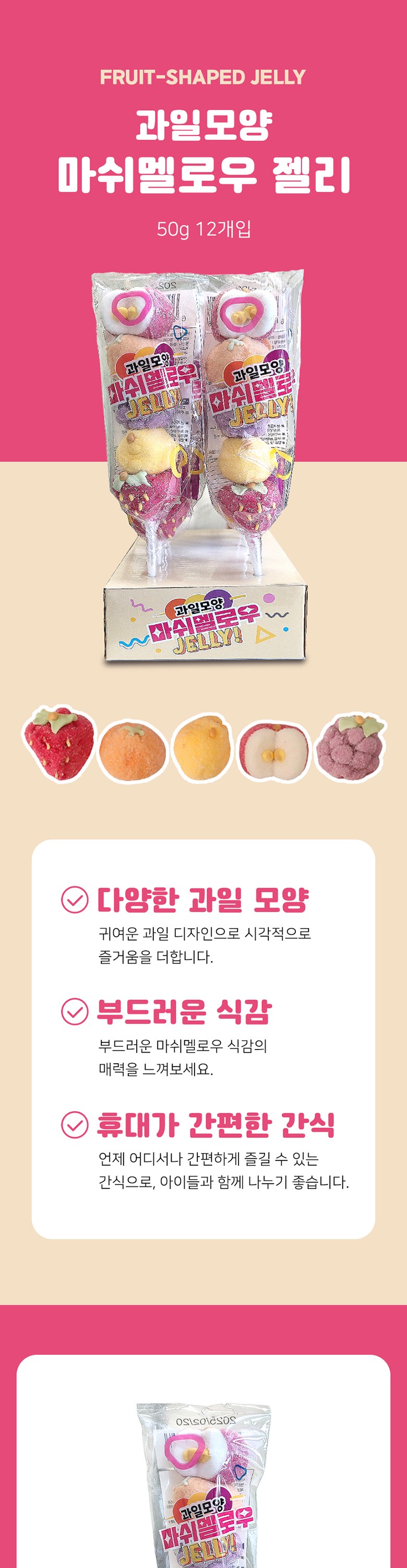 | 품목 또는 명칭 | 과일모양 마쉬멜로우 젤리 | 포장단위별 내용물의 용량(중량),수량,크기 | 600g (50g x 12개) |